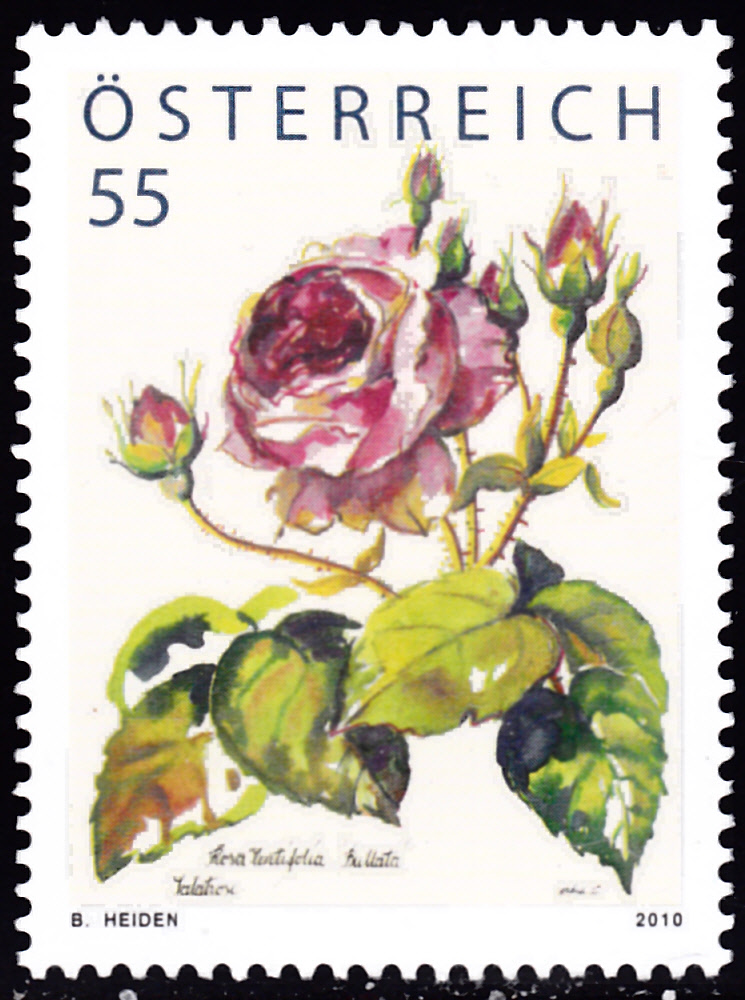 Aus Österreich kommt diese Marke mit einer Rose (Rosa centifolia). Diese Marke wurde von der Post nicht verkauft, sondern nur an ihre Abonnenten verschenkt.