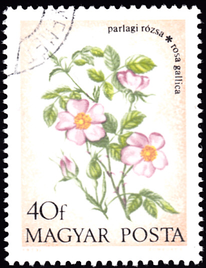 Auf dieser Marke aus Ungarn (MiNr 2887 A) ist eine Essig-Rose (Rosa gallica) abgebildet.