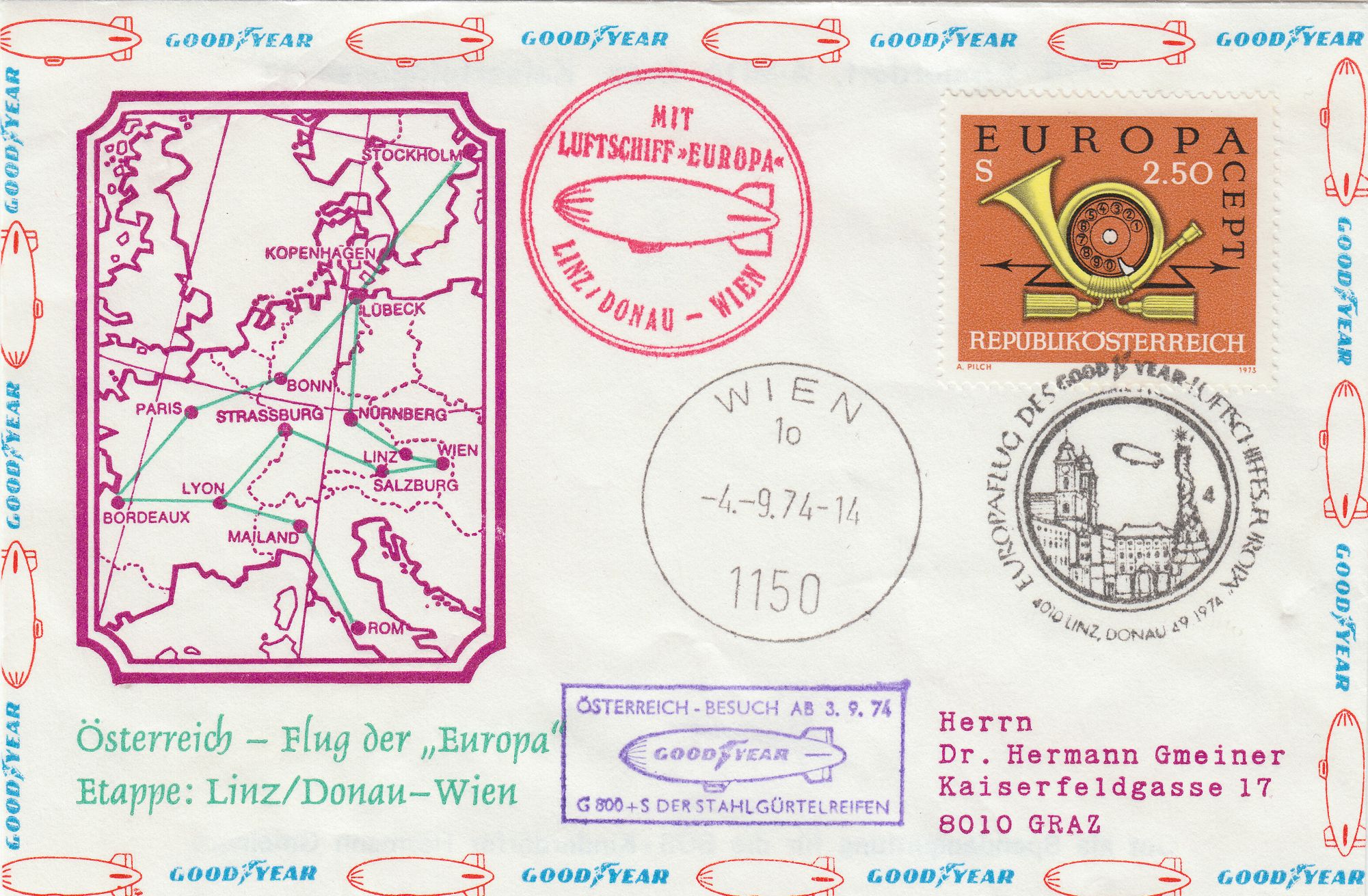 EF der Europamarke 1973 aus Österreich am 04.09.1974 auf einem Brief, der auf einer Fahrt des von der Firma Goodyear gesponserten Luftschiffs "Europa" von Linz nach Wien befördert wurde: