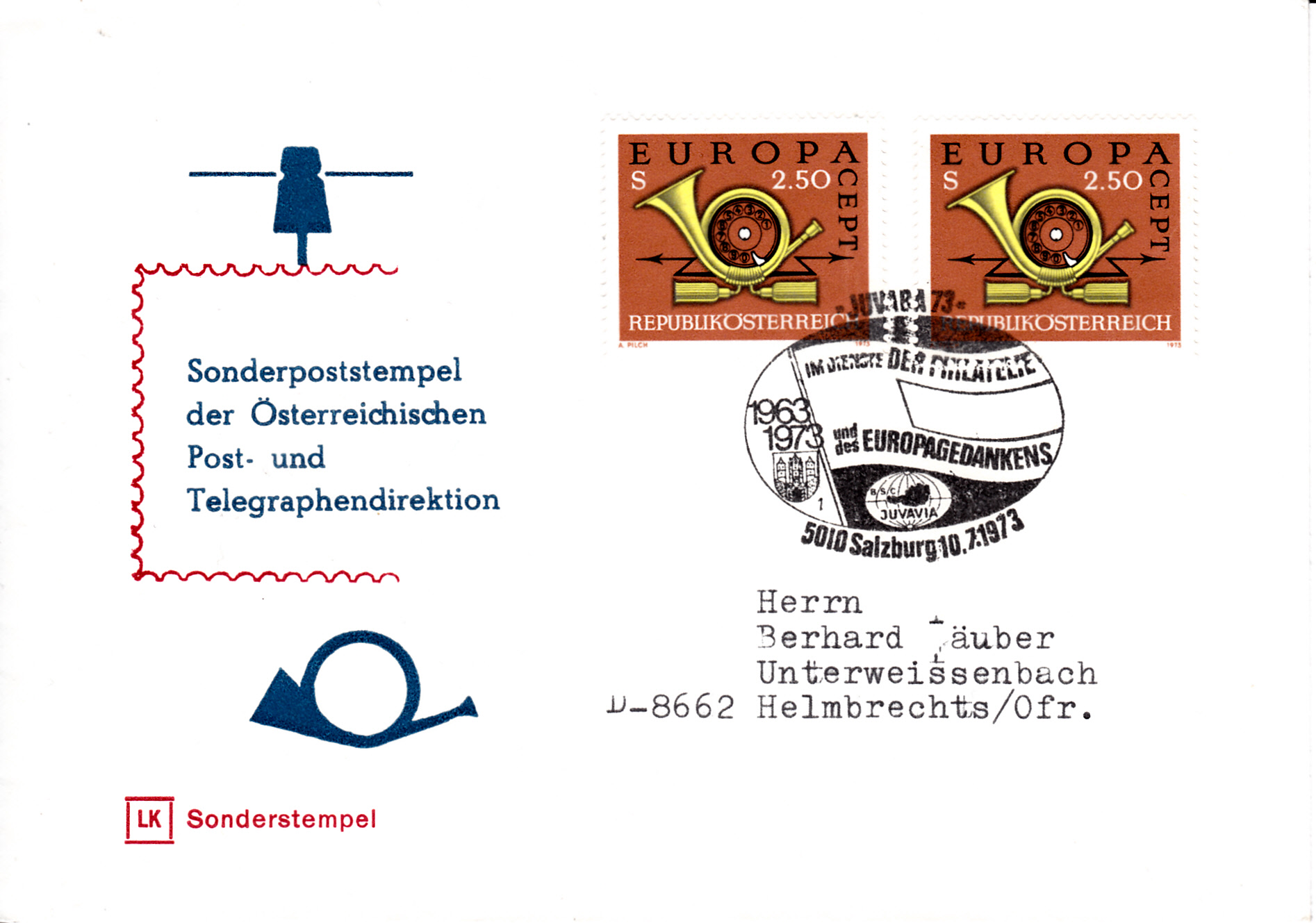 Brief mit zwei Europamarken 1973 und einen zum Thema "Europa" passenden Sonderstempel von 10.7.1973 aus Salzburg mit der Kennziffer "1".