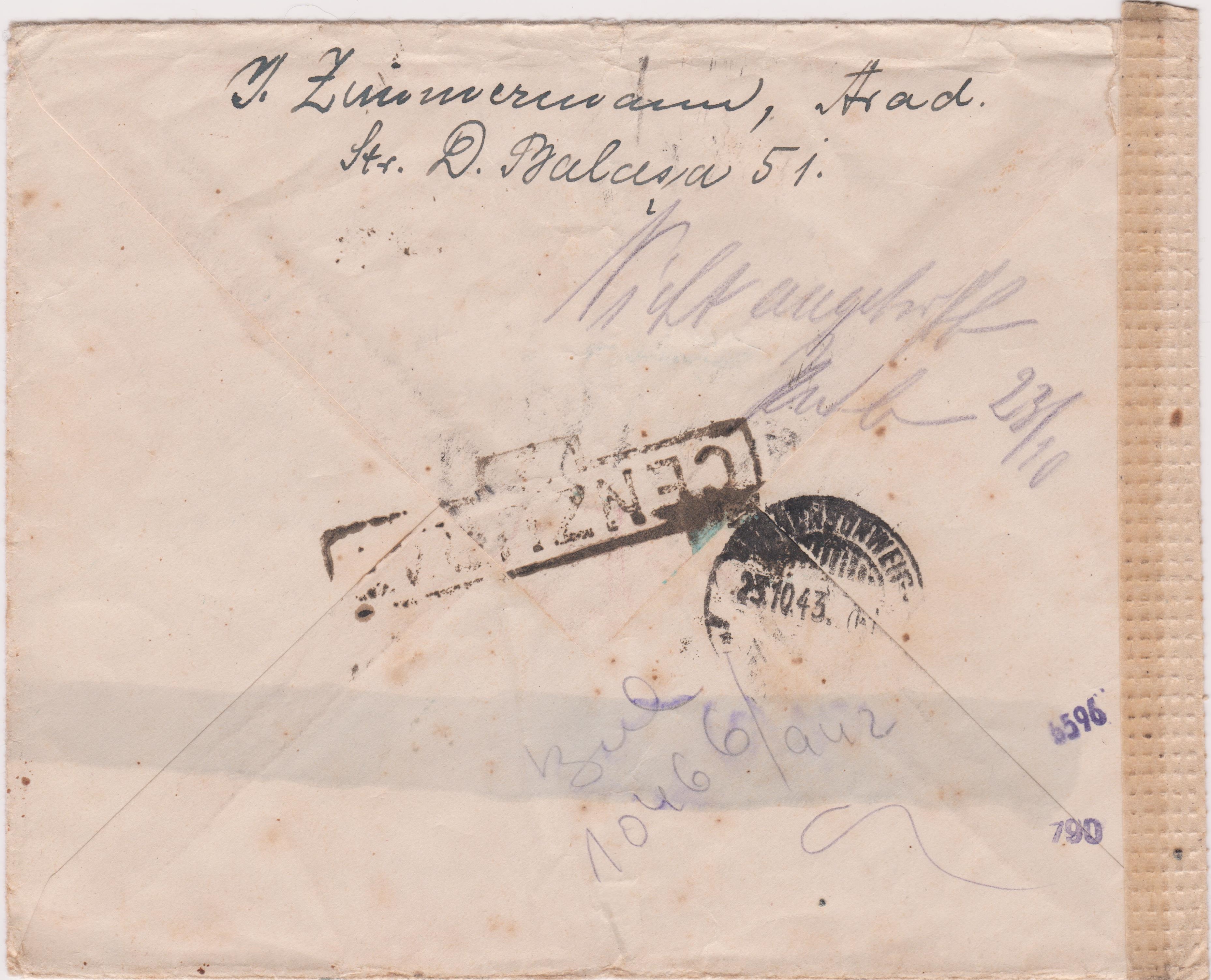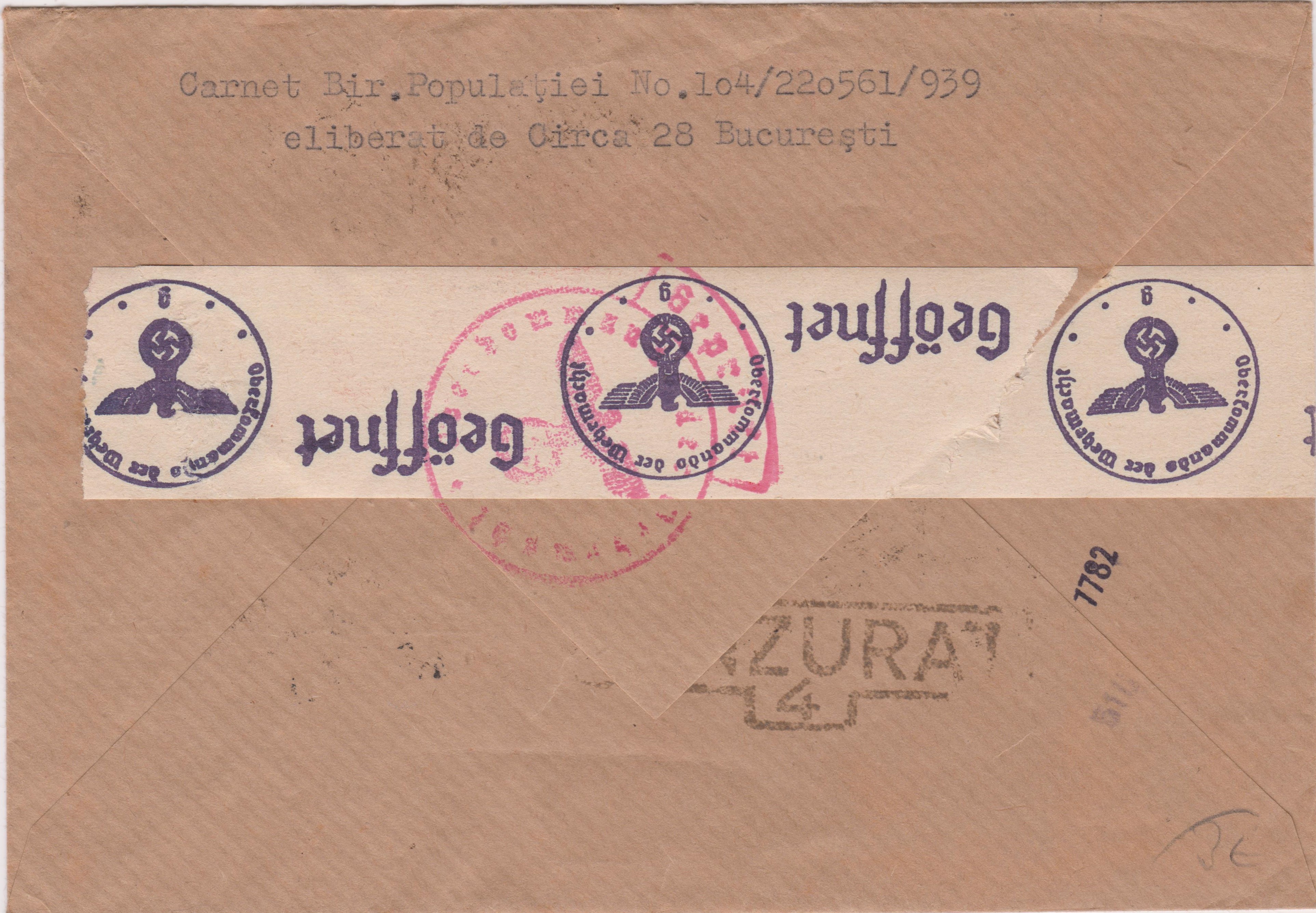 Der Brief lief in Rumänien durch die Zensur, was ein rückseitig abgeschlagener Zensurstempel "CENZURAT" dokumentiert.