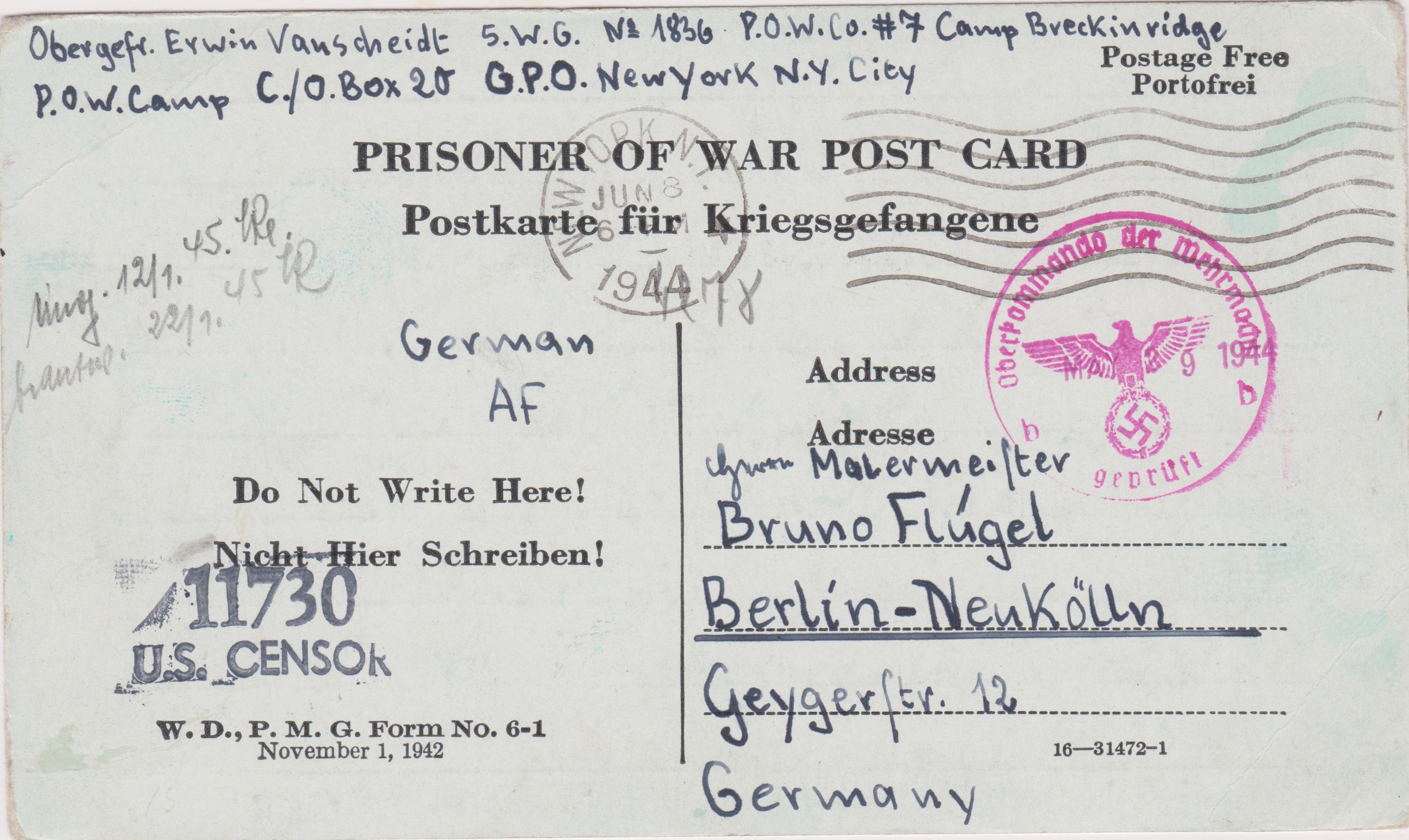 Diese Postkarte für Kriegsgefangene wurde in den USA geprüft, was ein Prüferstempel "10738 U.S. Censor" in Schwarz dokumentiert: