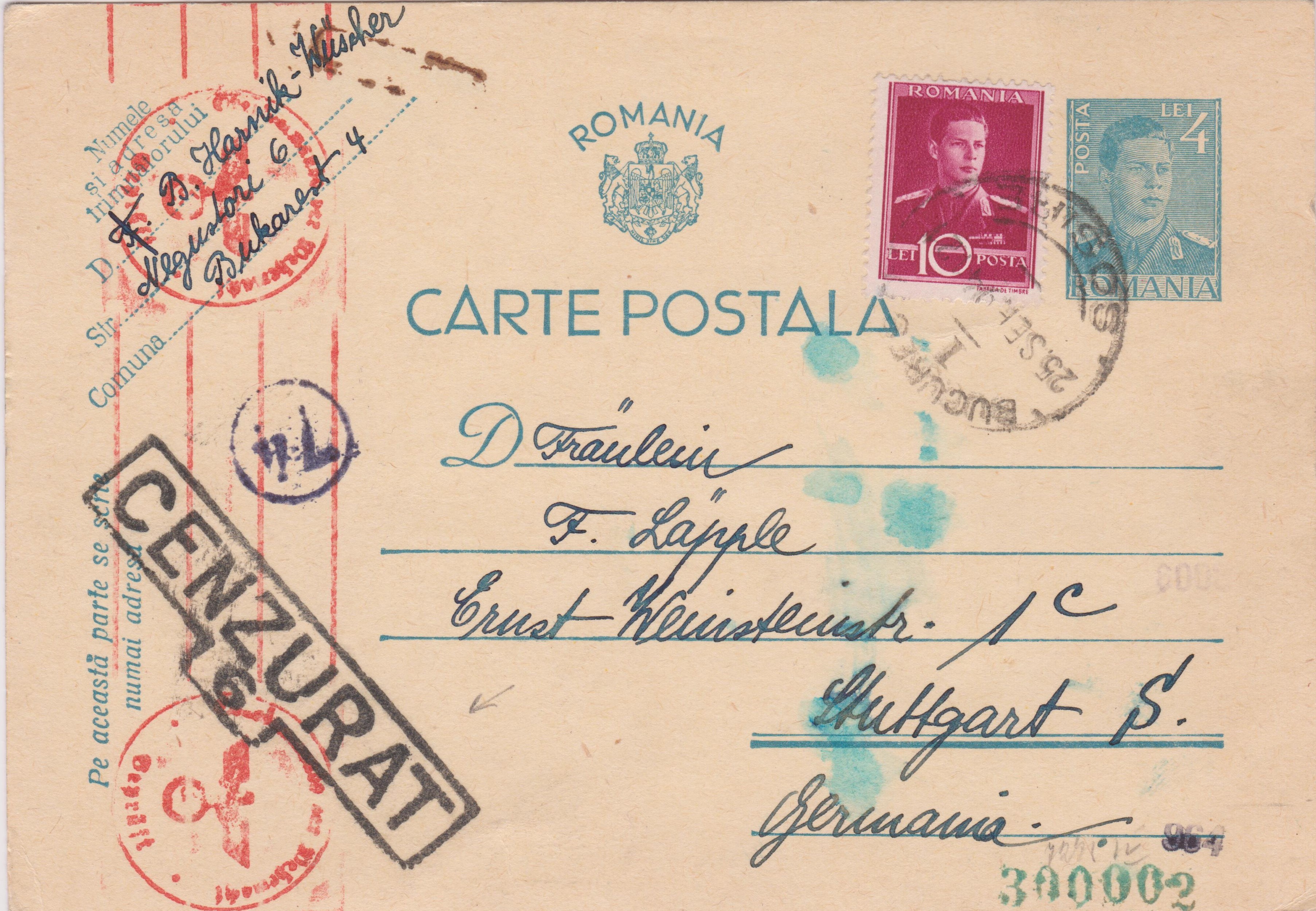 Diese nach "Stuttgart" adressierte Postkarte wurde am 25.09.1941 in Bukarest in Rumänien aufgegeben: