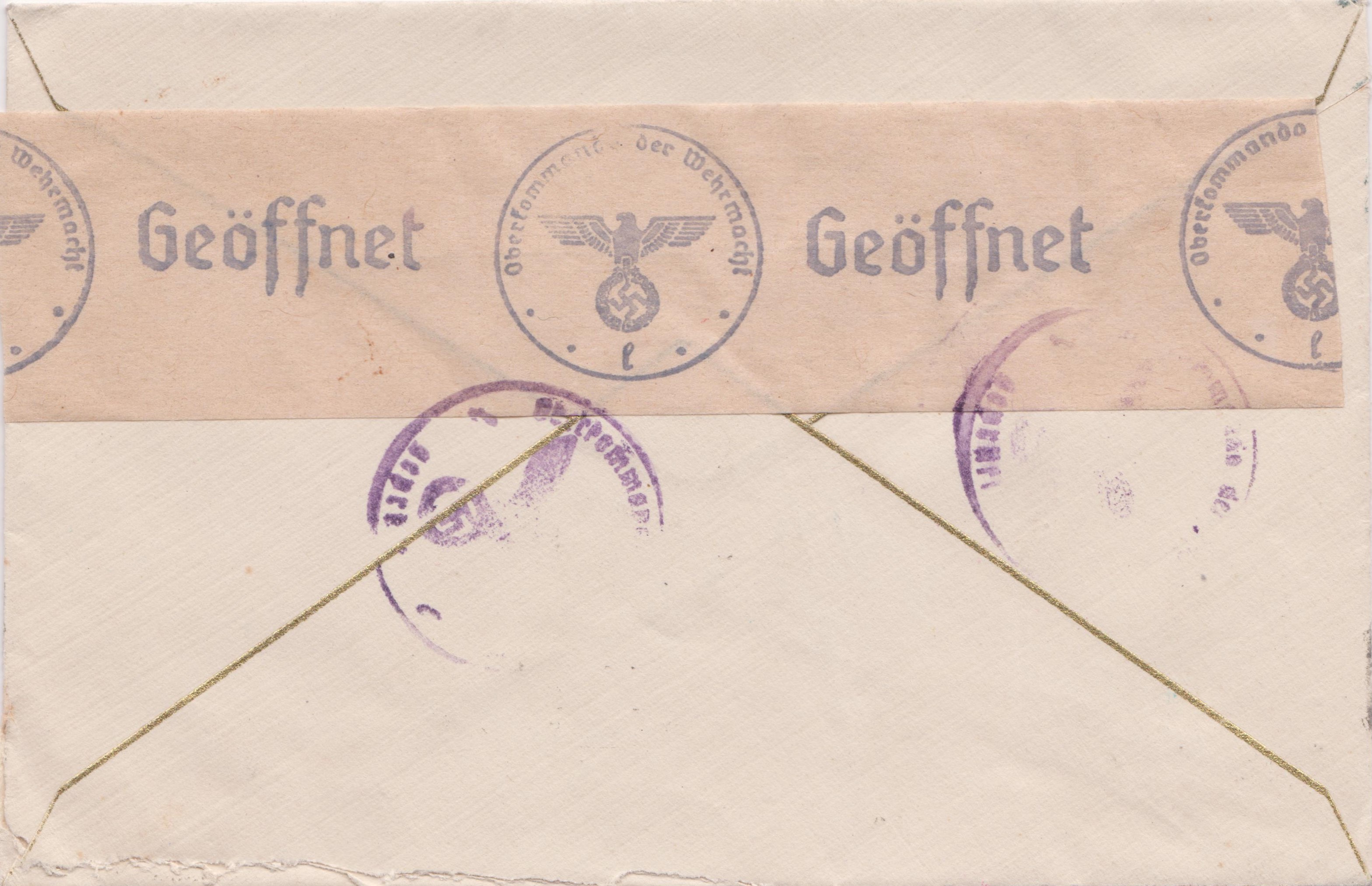 Der Beleg wurde in der BP Lyo rückseitig geöffnet und nach erfolgter Prüfung mit einem gedruckten Streifen "Geöffnet Oberkommando der Wehrmacht l", Landsmann LV1.1, wieder verschlossen, was ein Prüfstempel, Landsmann LP1.1, dokumentiert.
