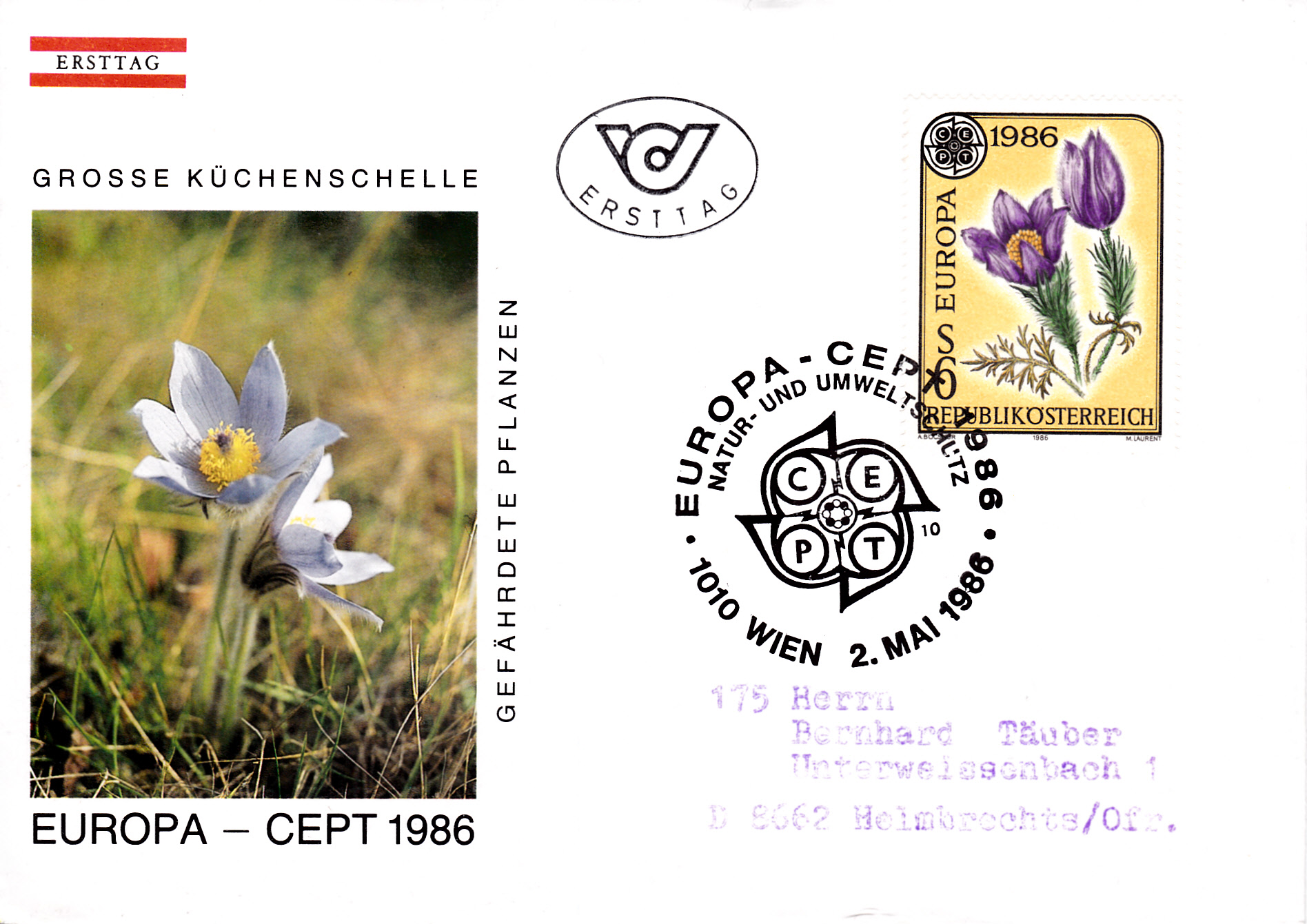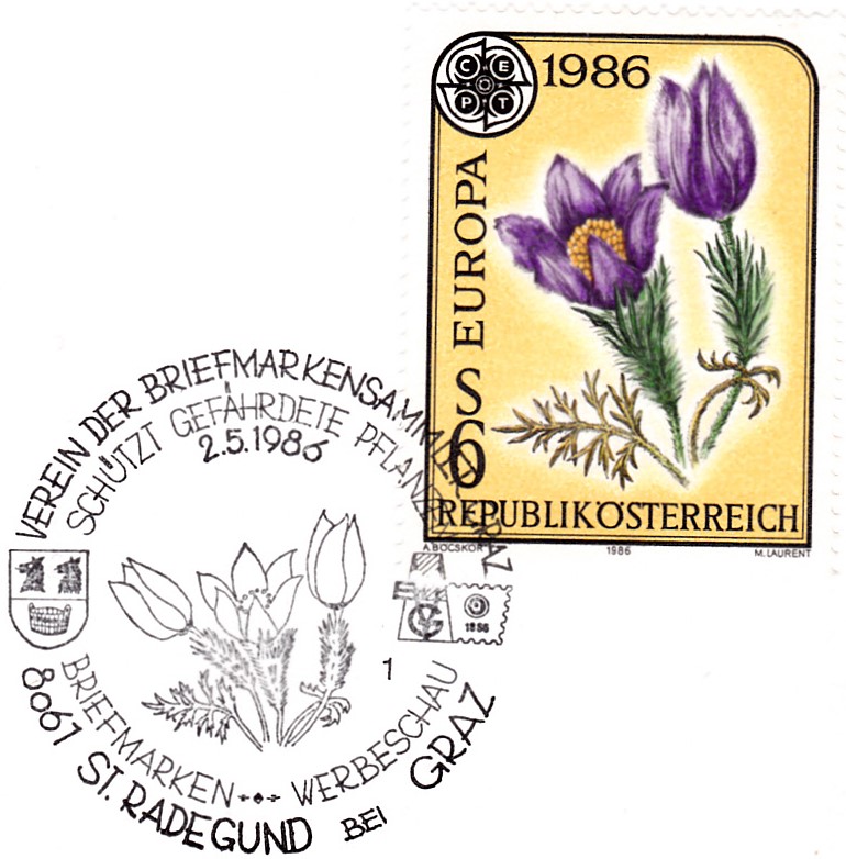 In Österreich erschien eine Europamarke 1986 am 2. Mai 1986 zum Gemeinschaftsthema "Natur- und Umweltschutz". Hier diese Marke zu 6 Schilling mit der Abbildung einer Große Küchenschelle (Pulsatilla grandis), die in einer Auflage von 3 500 000 Stück erschien.