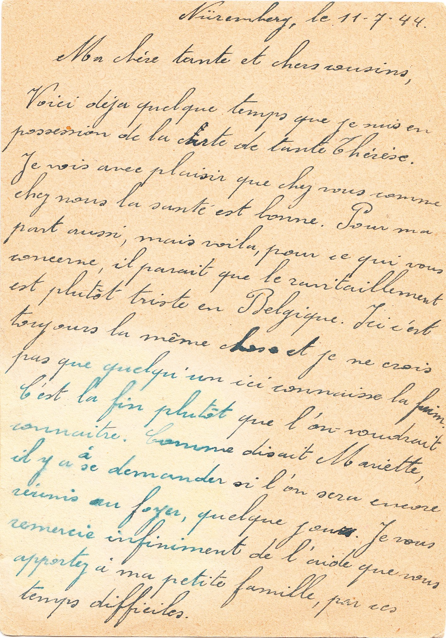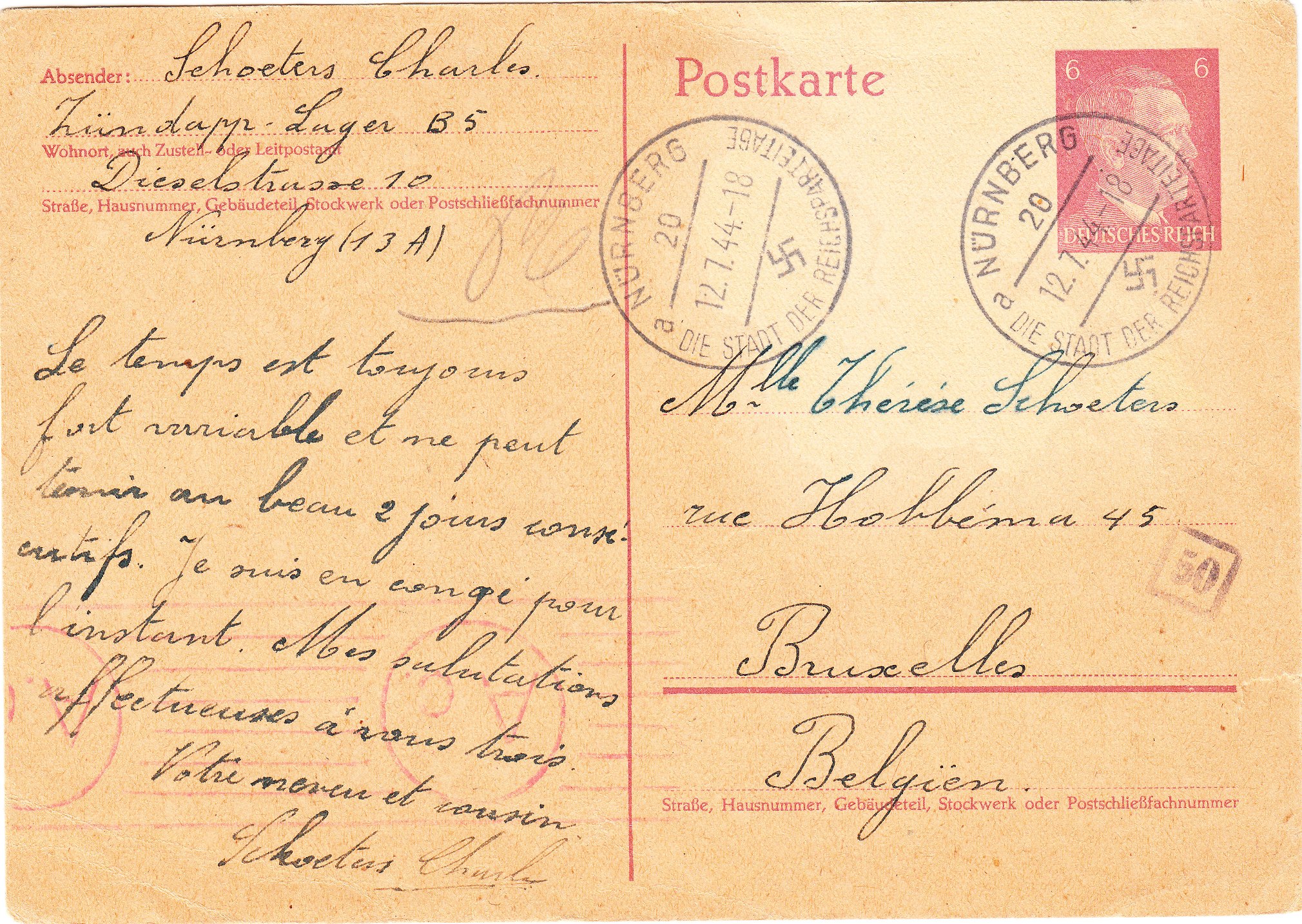 Diese nach Brüssel adressierte Postkarte wurde am 11.07.1944 von einem Belgier namens Charles Schoeters an seine Tante und seine Cousinen geschrieben: