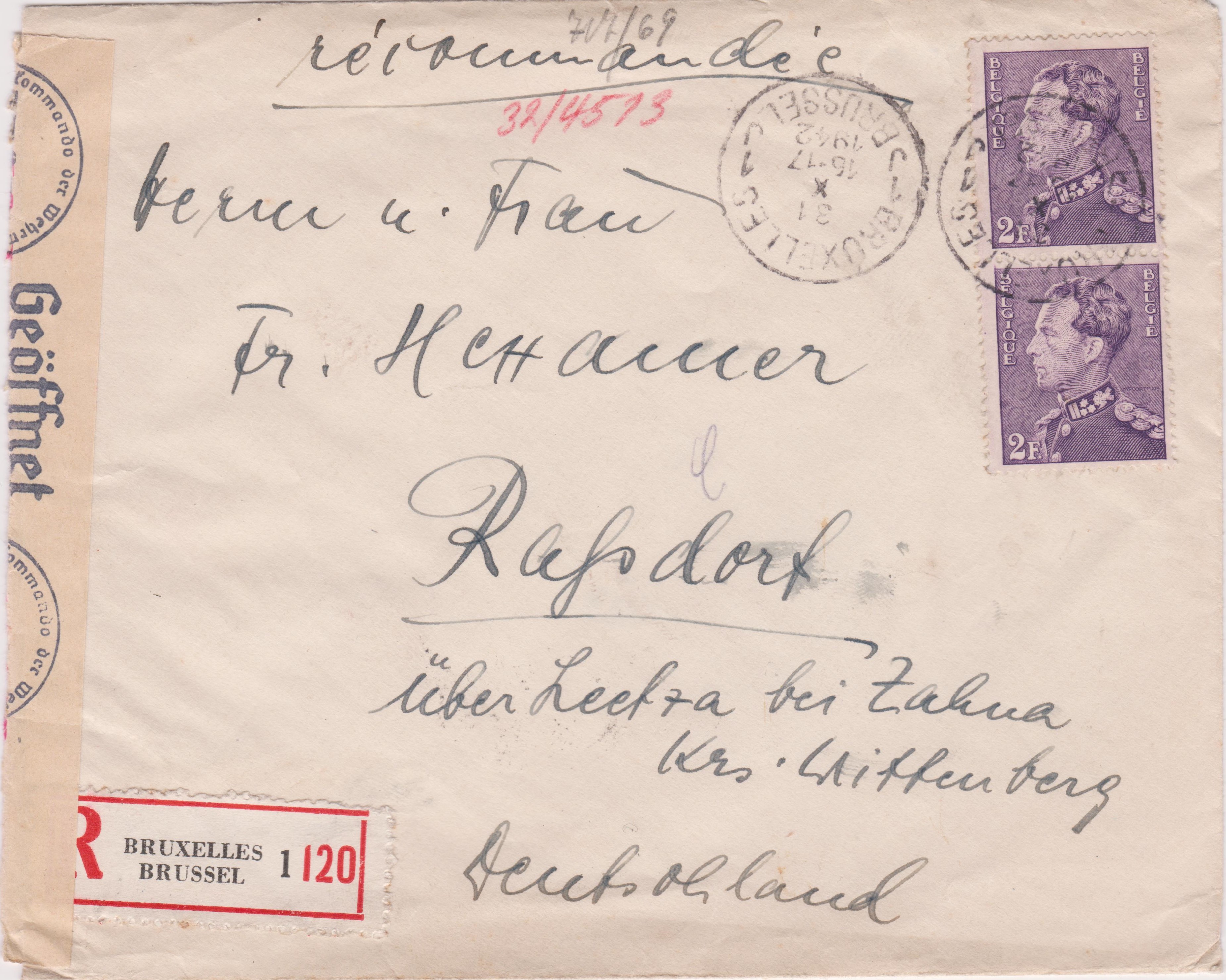 Dieser nach "Raßdorf über Leetza bei Zahna Krs Wittenberg" adressierte Brief per Einschreiben wurde am 31.10.1942 in Brüssel aufgegeben: