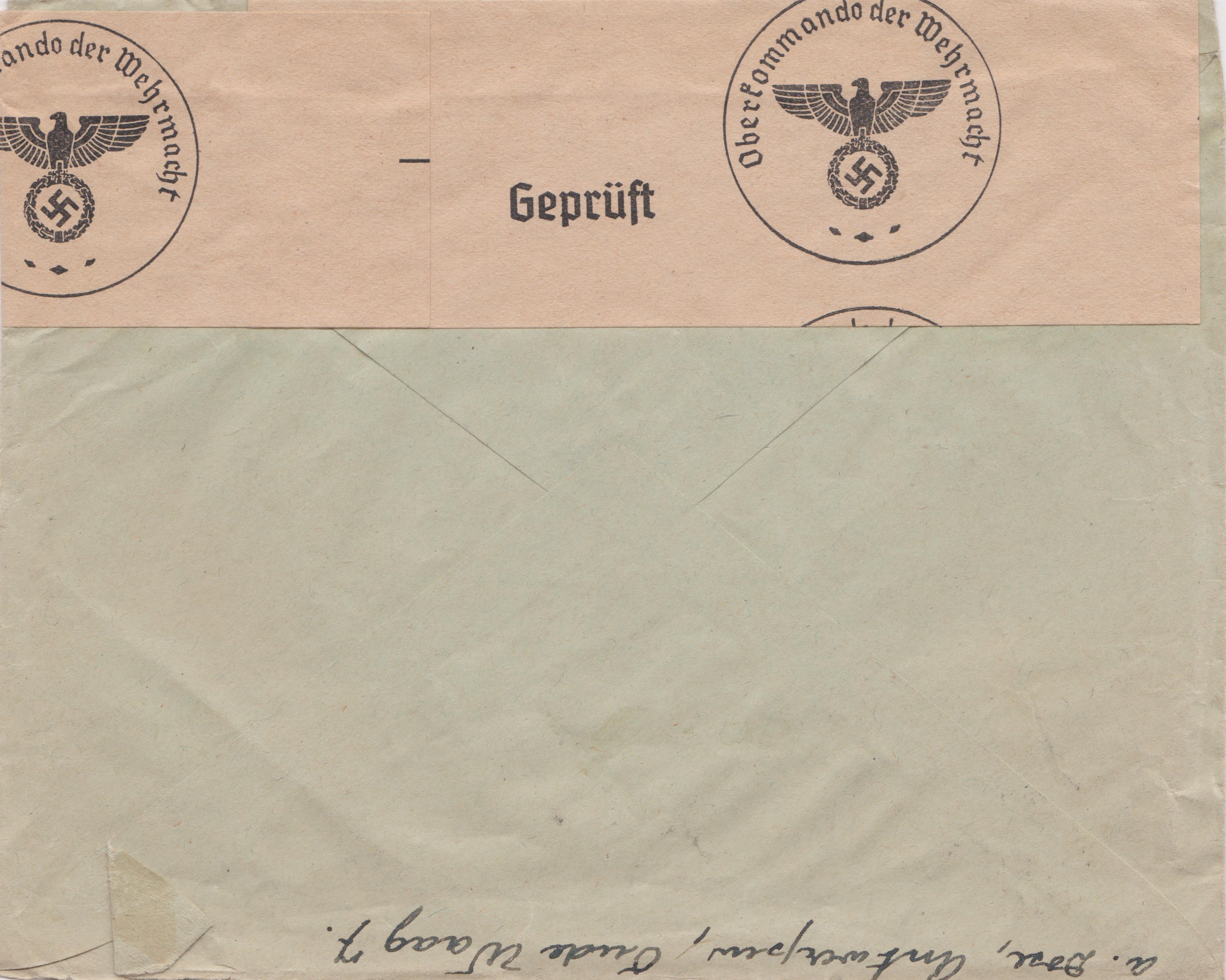 Der Brief wurde der Auslandsbriefprüfstelle Köln zugeleitet, wo er linksseitig geöffnet und nach erfolgter Prüfung mt einem Verschlußstreifen, Landsmann CV3.2, wieder verschlossen wurde, was ein Prüfstempel, Landsmann CP3.2, dokumentiert.