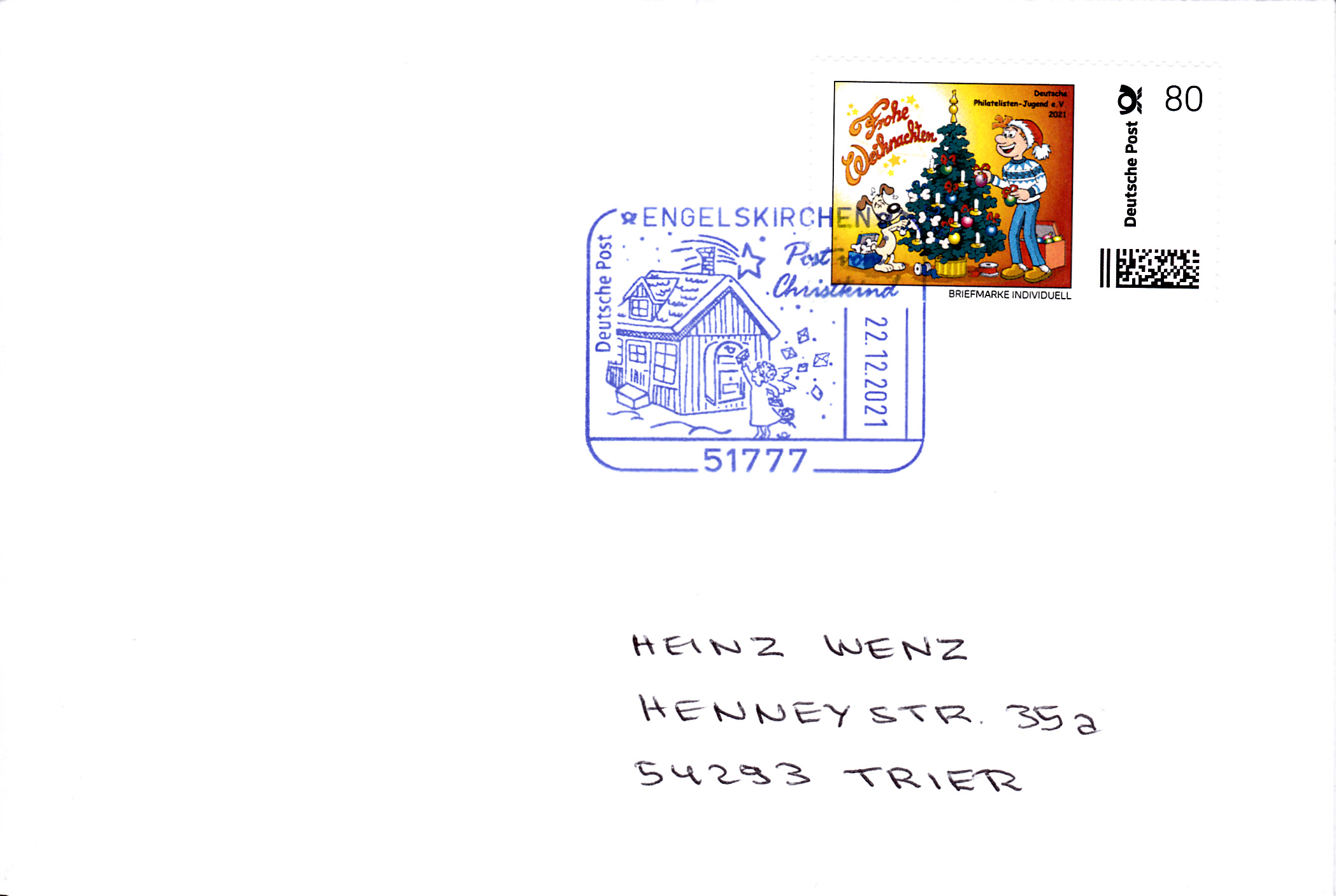 Brief mit der Marke individuell "Weihnachten 2021" der DPhJ und dem Sonderstempel aus Engelskirchen vom 22.12.2021.