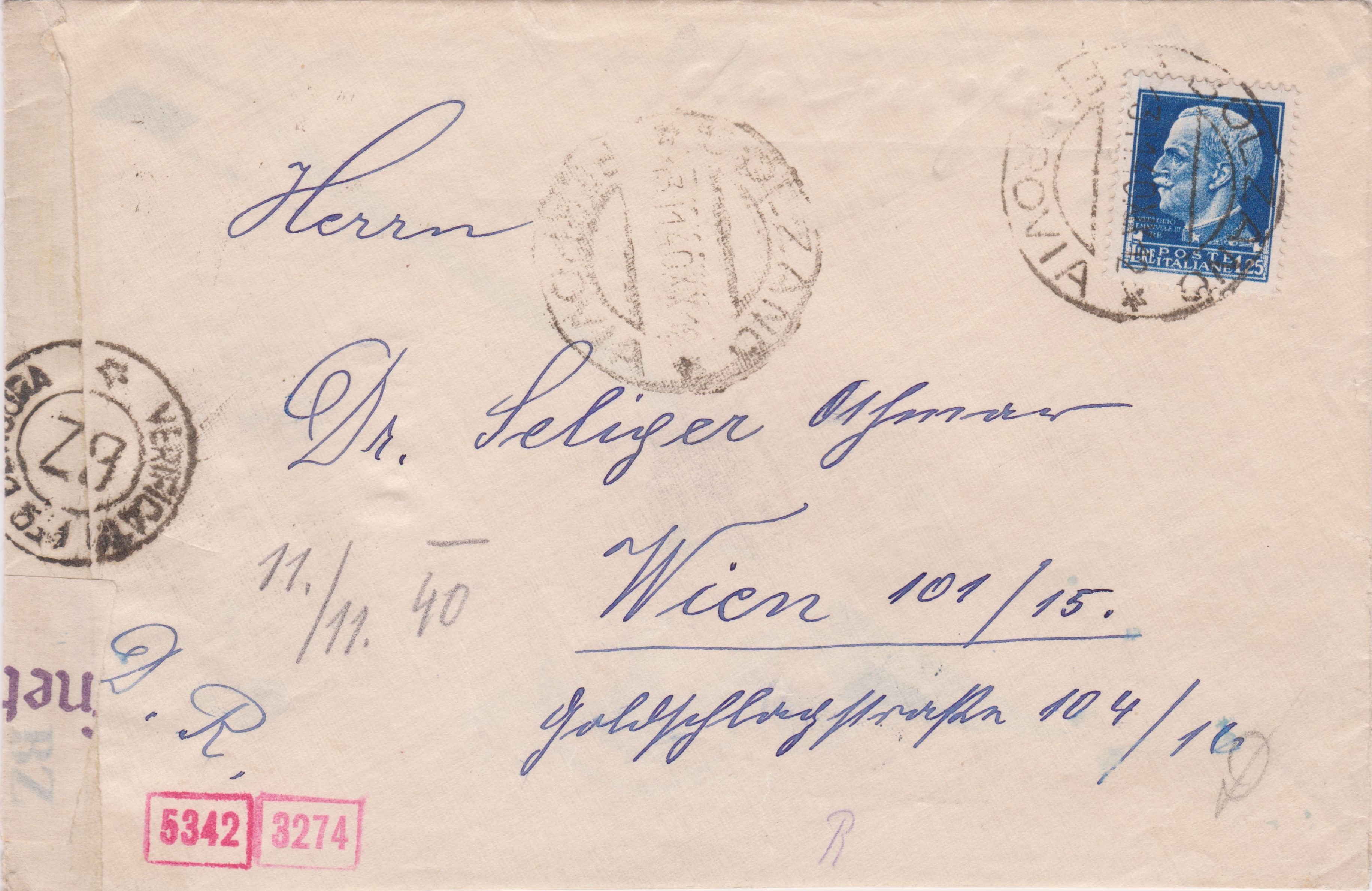 Dieser nach Wien adressierte Brief wurde am 13.11.1940 in "BOLZANO" in Italien aufgegeben:
