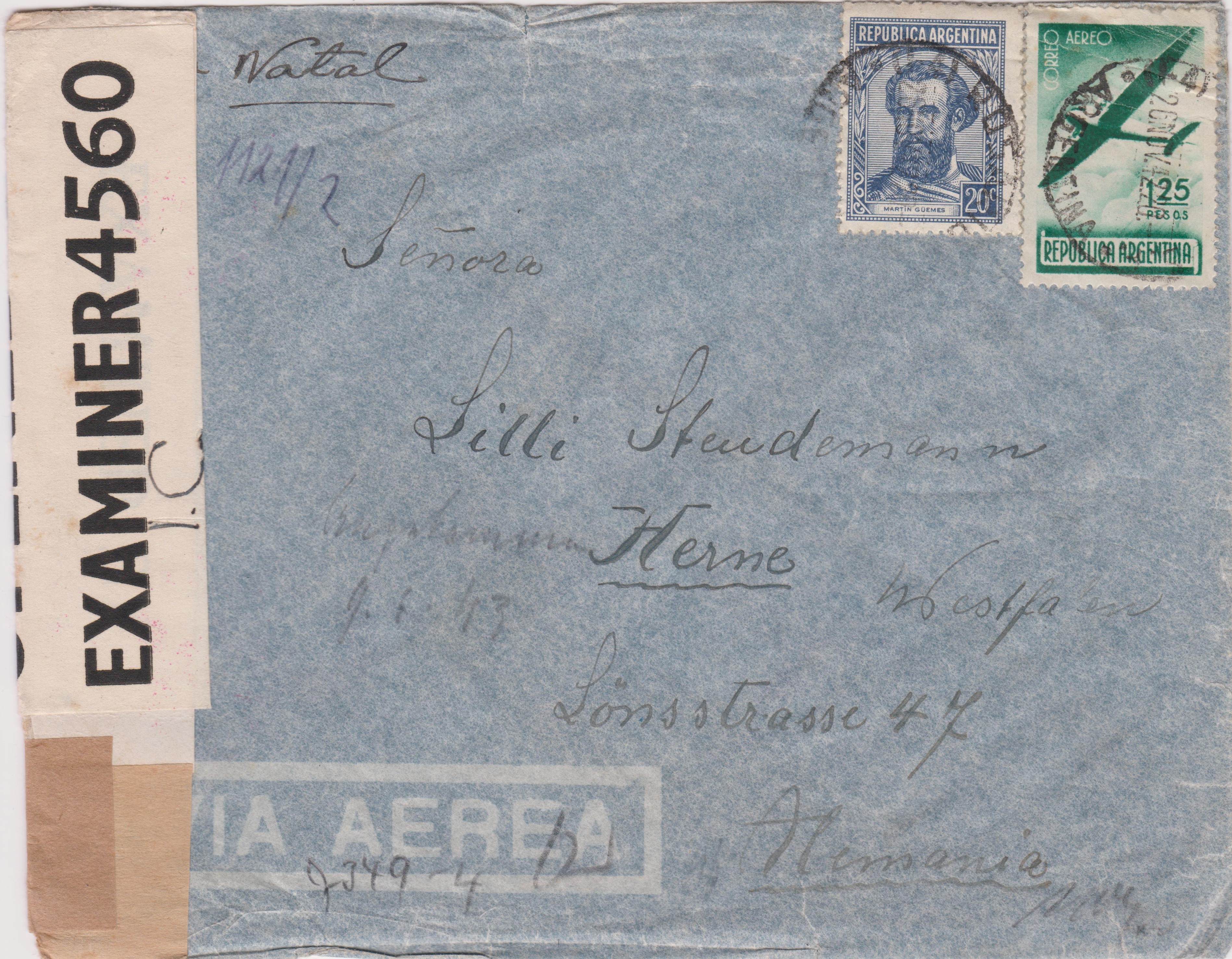 Dieser nach "Herne" adressierte Luftpostbrief wurde am 26.11.1942 in Argentinien aufgegeben: