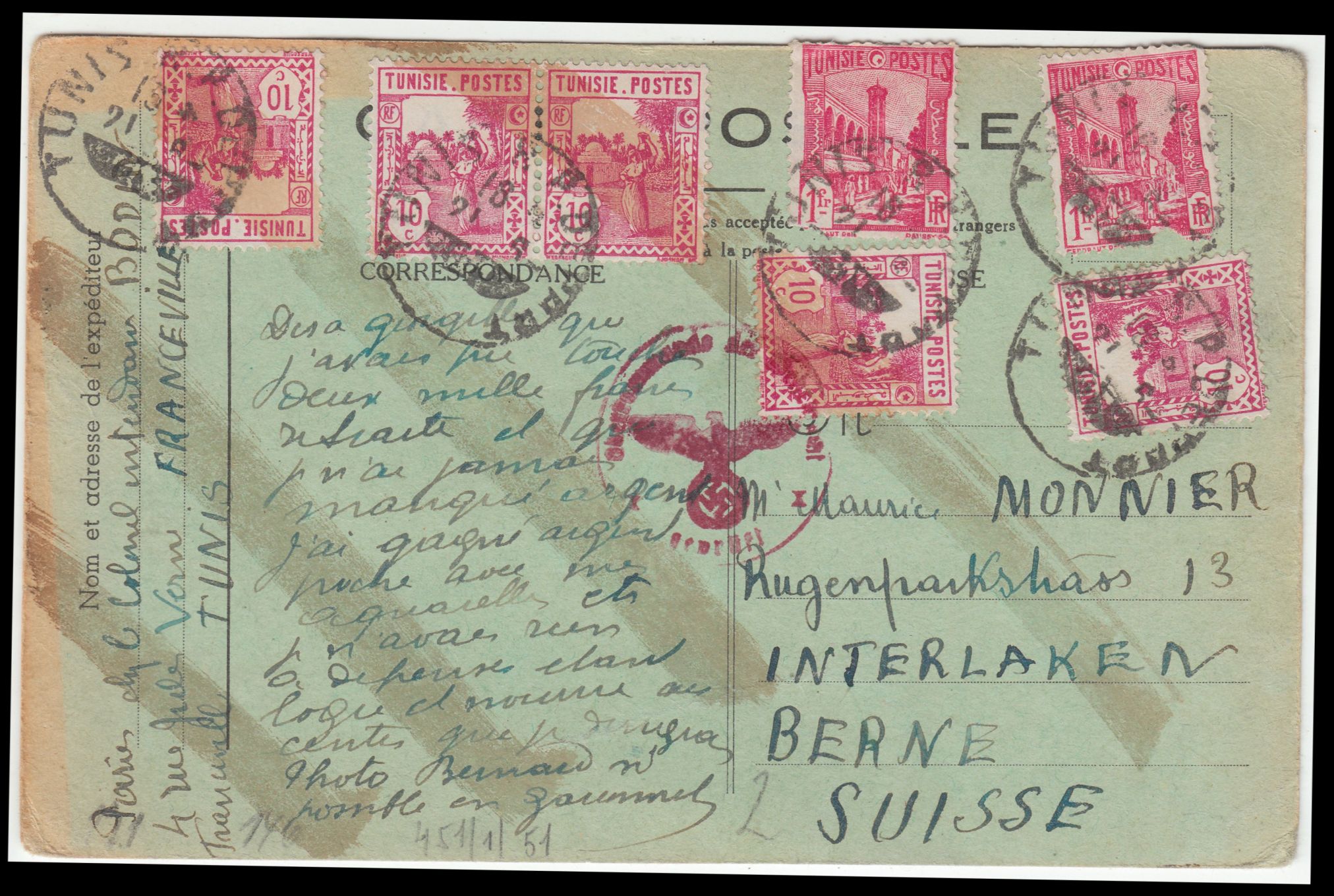 Dann wurde dieser Brief als "Post aus dem feindlichen Ausland in die Schweiz" der dafür zuständigen ABP Paris zugeleitet, wo er rückseitig geöffnet und nach erfolgter Prüfung mit einem Verschlußstreifen, Landsmann XV1.1, wieder verschlossen wurde, was zwei Handprüfstempel, Landsmann XP6.2, dokumentieren.