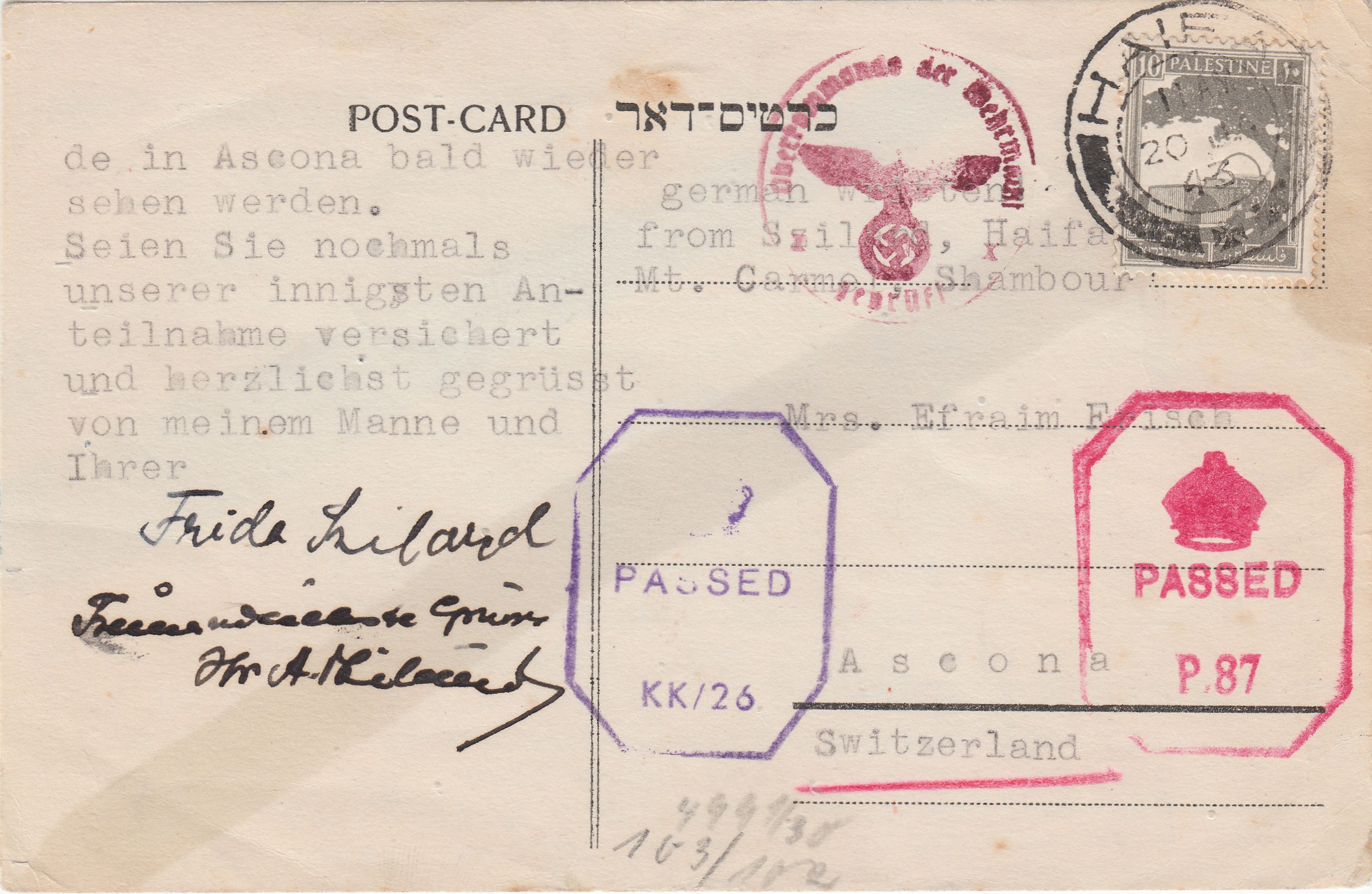 Der Beleg durchlief die britische Prüfstelle in London, wo er linksseitig geöffnet und nach erfolgter Prüfung mit einem Verschlußzettel "P. C. 90 OPENED BY EXAMINER 601" (P. C. = Postal Censorship) wieder verschlossen wurde.