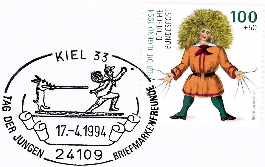 Der Sonderstempel aus Grossrosseln (Ortsteil St. Nikolaus) zur Briefmarkenausstellung am Nikolaustag 1994 zeigt die Illustration zu den Versen: