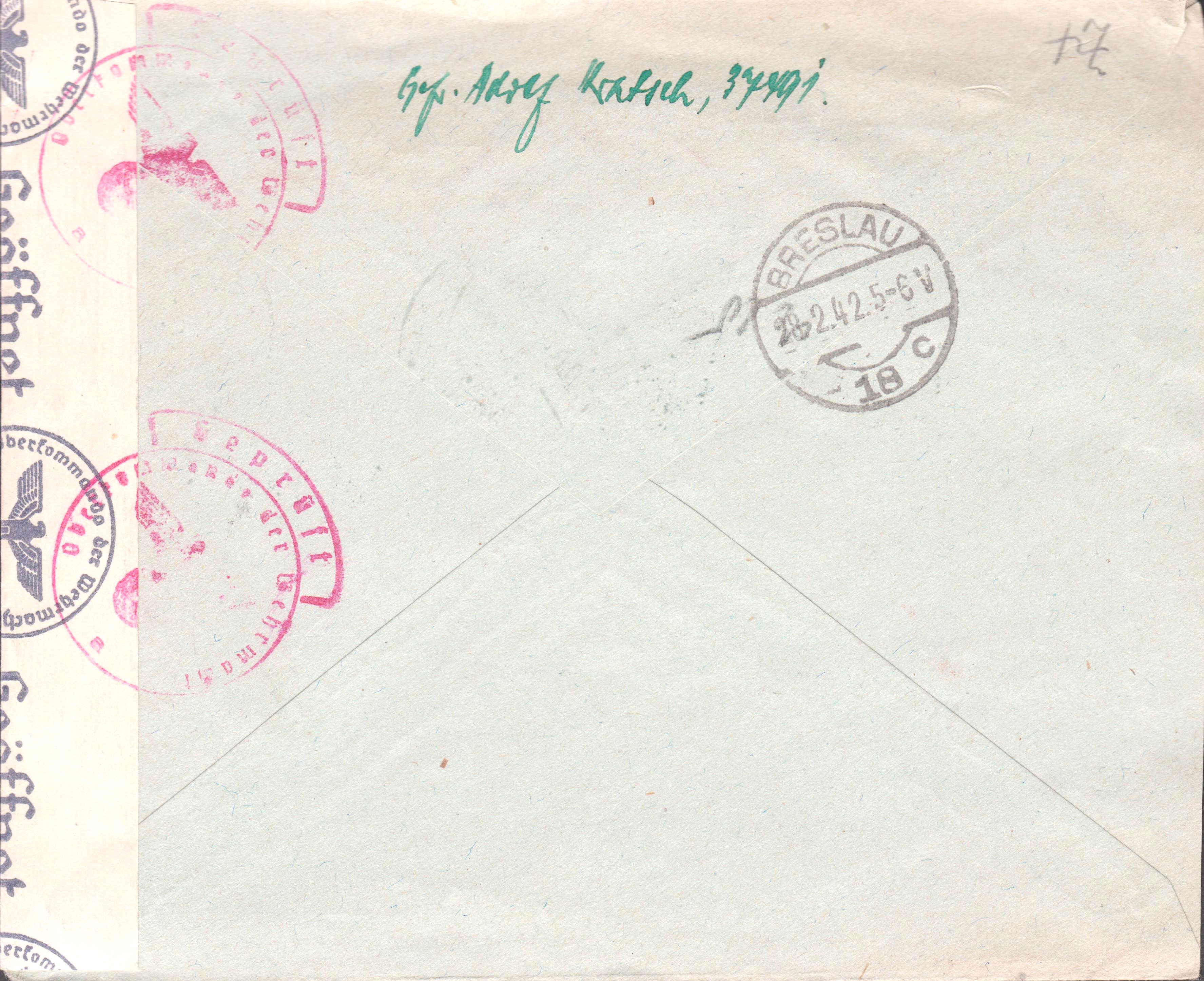 Der Brief wurde der Auslandsbriefprüfstelle Königsberg zugeleitet, wo er rechtsseitig geöffnet und nach erfolgter Prüfung mit einem Verschlußstreifen, Landsmann AV3.1, wieder verschlossen wurde, was ein Handprüfstempel, Landsmann AP 3.1, dokumentiert.
