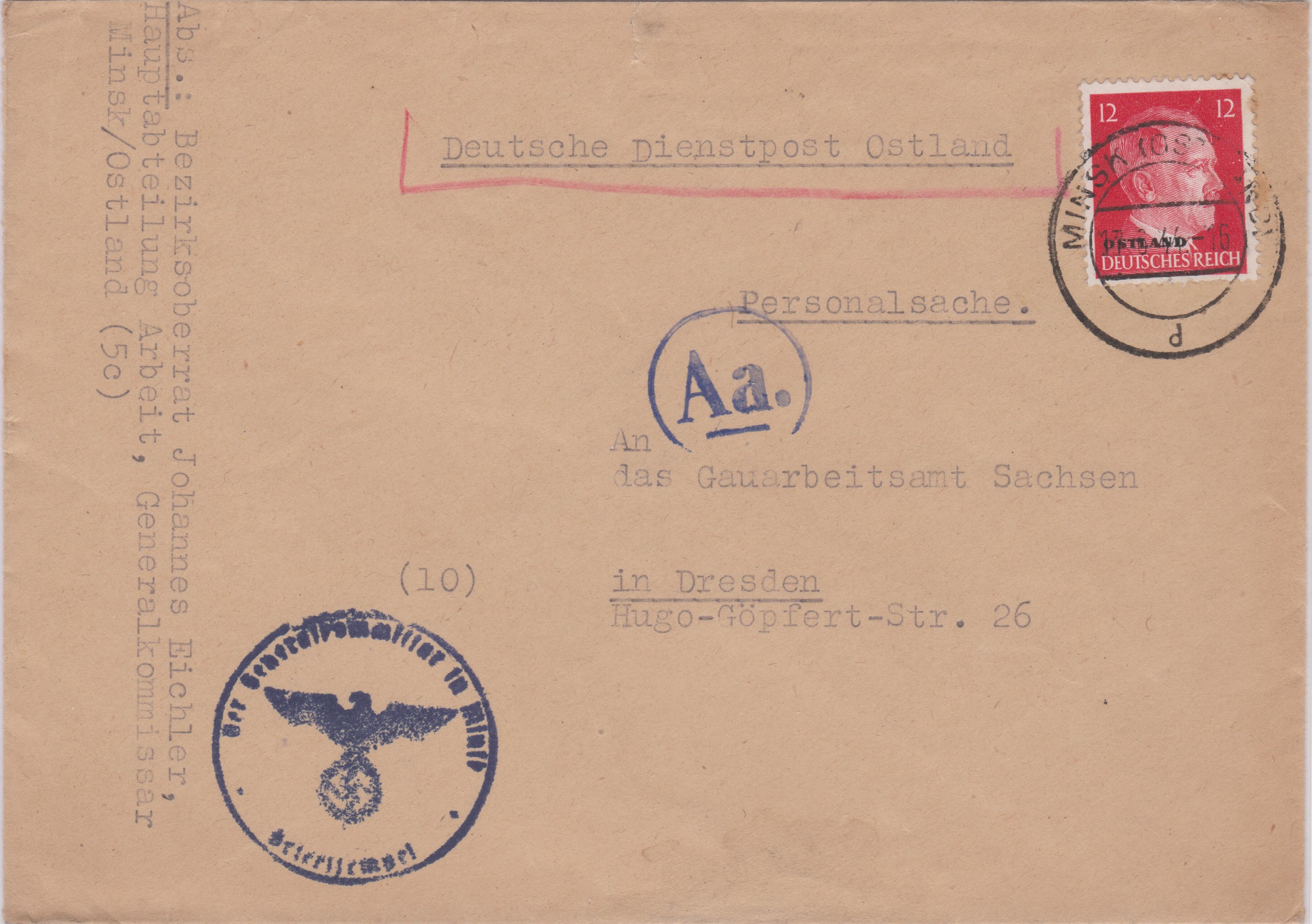 Brief im Fernverkehr nach Dresden, Portostufe 12 Pf, mit Einzelfrankatur Deutsche Dienstpost Ostland am 17.03.1944 ab MINSK (OSTLAND):