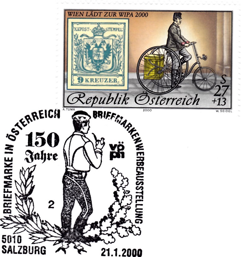 FDC mit der hier bereits gezeigten Marke (MiNr 2270 II) aus dem Block zur Internationalen Briefmarkenausstellung WIPA 2000 in Wien mit der Jahreszahl "2000" mit anhängendem Zierfeld aus dem Block und einem passenden Sonderstempel aus Innsbruck mit der Kennziffer "1".