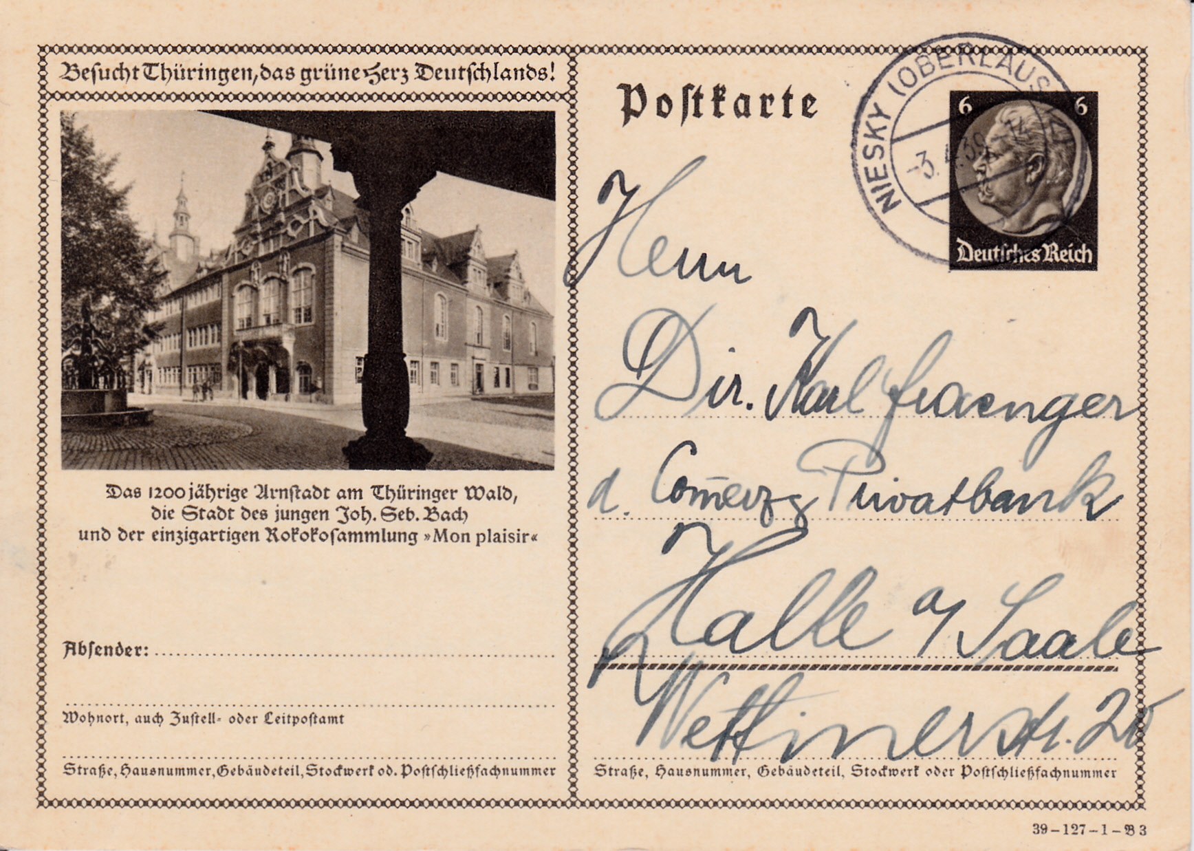 Auch Arnstadt wiederholt auf dieser Karte (Serie 127 Bild 3) den Blick auf das Rathaus aus den Jahre 1937 und 1938.