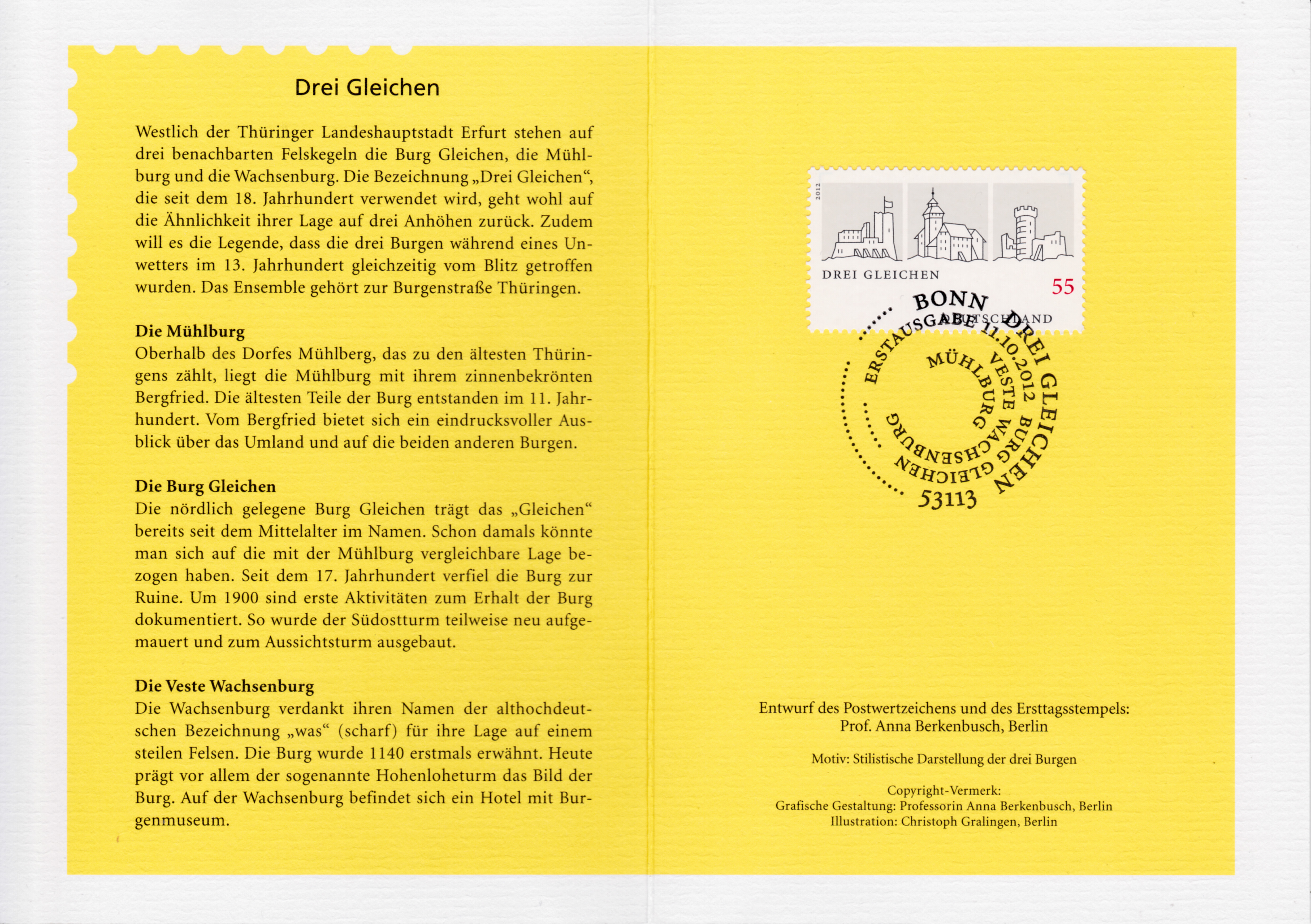 Die Klappkarte des Vorstandsvorsitzenden der Deutschen Post AG mit der Marke "Burgenensemble Drei Gleichen" und dem Ersttagsonderstempel Bonn gibt ein paar Informationen über die Burg Gleichen, die Mühlburg und die Wachsenburg.