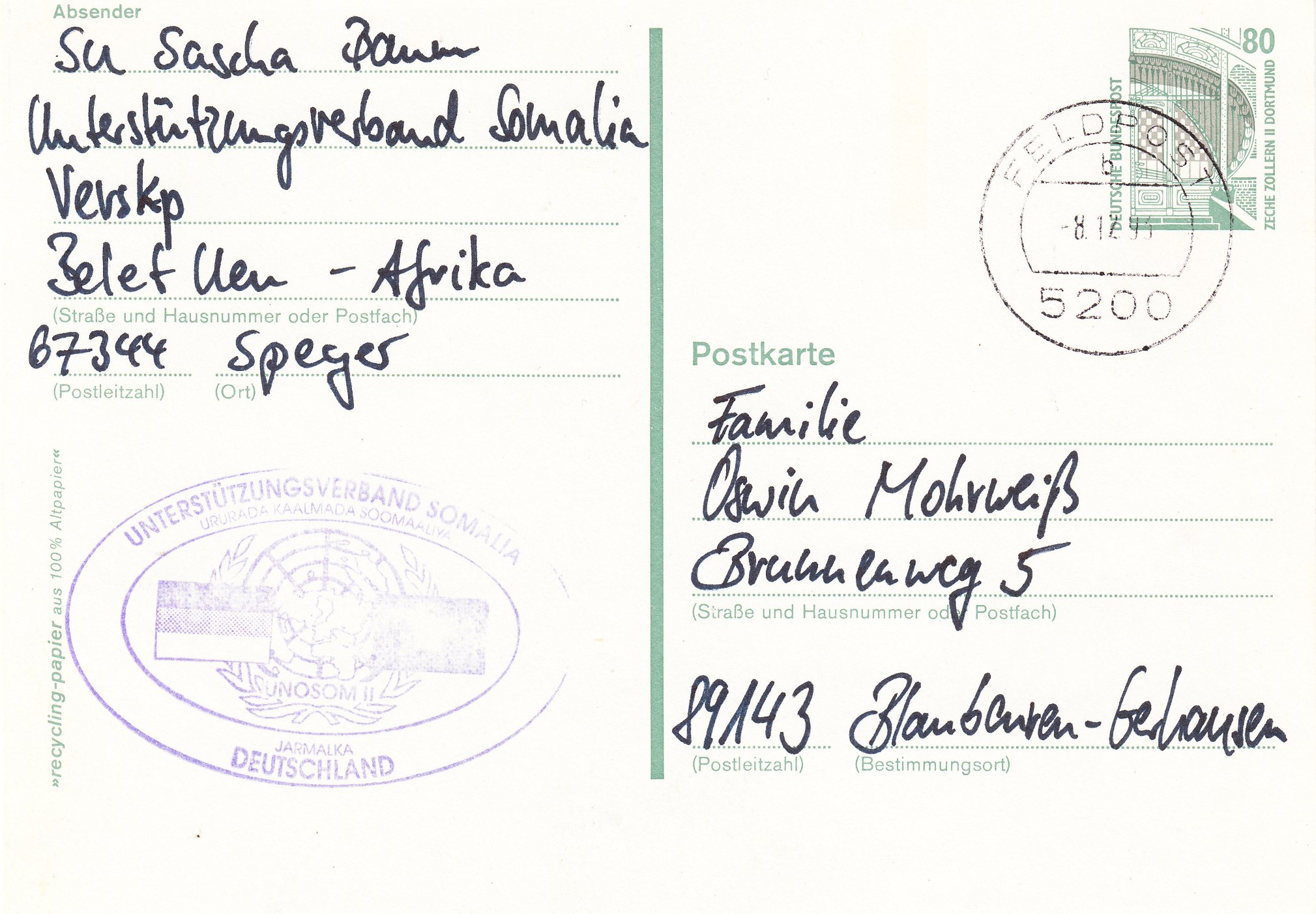 Diese nach Deutschland adressierte Postkarte wurde am 05.01.1994 frankiert mit einem 100 Pfennig Wert beim Feldpostamt "FELDPOST 5200" in Belet Uen aufgegeben und per Handstempel mit Kennbuchstabe "a" entwertet. Auch in diesem Falle hätten 80 Pfennig als Porto für die Postkarte ausgereicht, denn 100 Pfennig war das Briefporto: