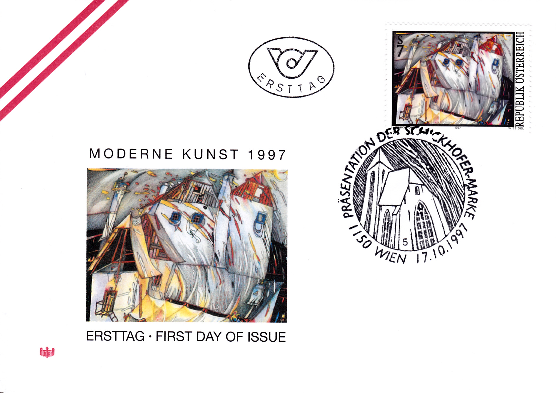 Auf einer Marke aus Österreich (MiNr 2234) ist das Gemälde "Haus im Wind" von Helmut Schickhofer zu sehen.
