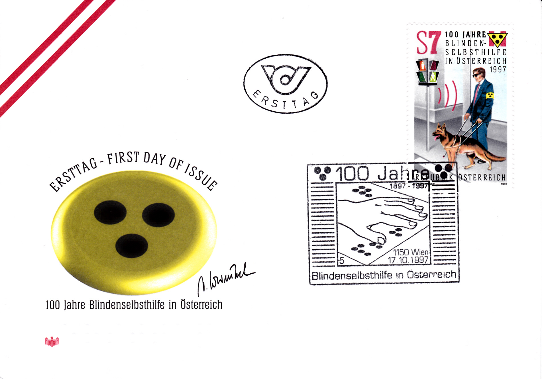 Diese Marke aus Österreich (MiNr 2232) aus Anlass "100 Jahre Blindenselbsthilfe in Österreich" bildet einen Deutschen Schäferhund bei seinem Dienst als Blindenhund ab.