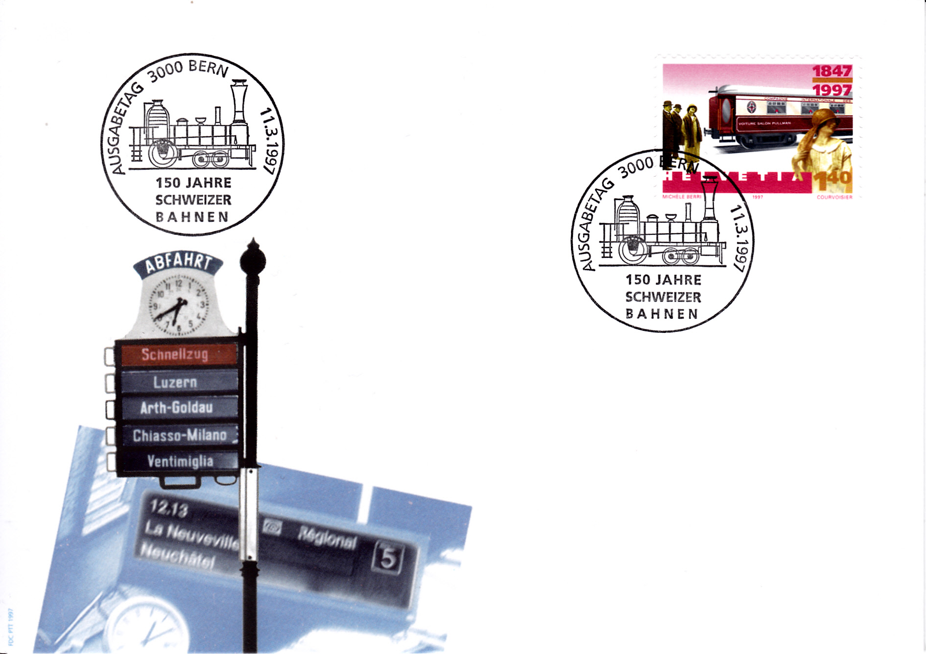 Die Marke zu 140 Rappen (MiNr 1603) zeigt einen "Pullmanwagen" (um 1920). Als Pullmanwagen werden verschiedene Arten von Eisenbahnwagen bezeichnet. Meist bezieht sich die Bezeichnung auf die luxuriösen, von der amerikanischen Pullman Palace Car Company gebauten und auf dem nordamerikanischen Eisenbahnnetz betriebenen Schlaf- und Salonwagen oder auf die in den 1920ern durch die Compagnie Internationale des Wagons-Lits in Europa eingeführten, komfortablen Salonwagen. Darüber hinaus wurde "Pullmanwagen" zum Überbegriff oder Spitznamen für verschiedene, besonders komfortable Eisenbahn- und Straßenbahnfahrzeuge.