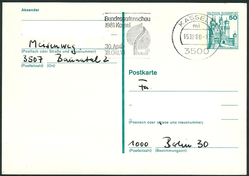 Dieser Maschinen-Stempel-Einsatz wirbt 1980 für die Bundesgartenschau 1981 in Kassel.