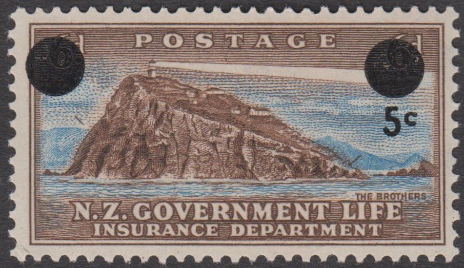 Neuseeland - Staatliche Lebensversicherung MiNr. 37 mit Buchdruck-Aufdruck der neuen Währung "5 c" in Schwarz (auf 6 P = MiNr. 31):
