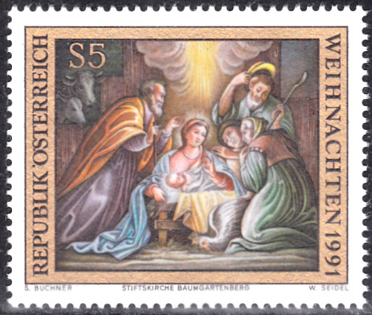 Die Weihnachtsmarke 1991 aus Österreich (MiNr 2041) zeigt das Fresko "Christi Geburt" in der Stiftskirche Baumgartenberg.