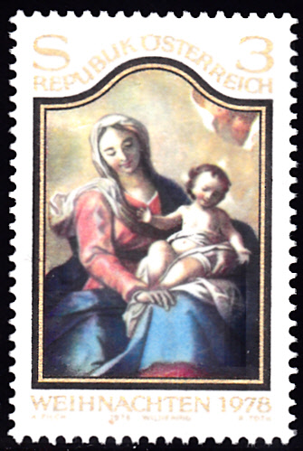 Die Weihnachtsmarke 1978 aus Österreich (MiNr 1591) zeigt "Maria mit Kind" nach einem Altarbild in der Stiftskirche von Wilhering von Martino Altomonte (1657–1745).