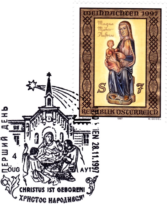 FDC mit der Weihnachtsmarke 1997 aus Österreich und einem zum Thema Weihnachten passenden Sonderstempel mit der Kennziffer "4" aus Wien.