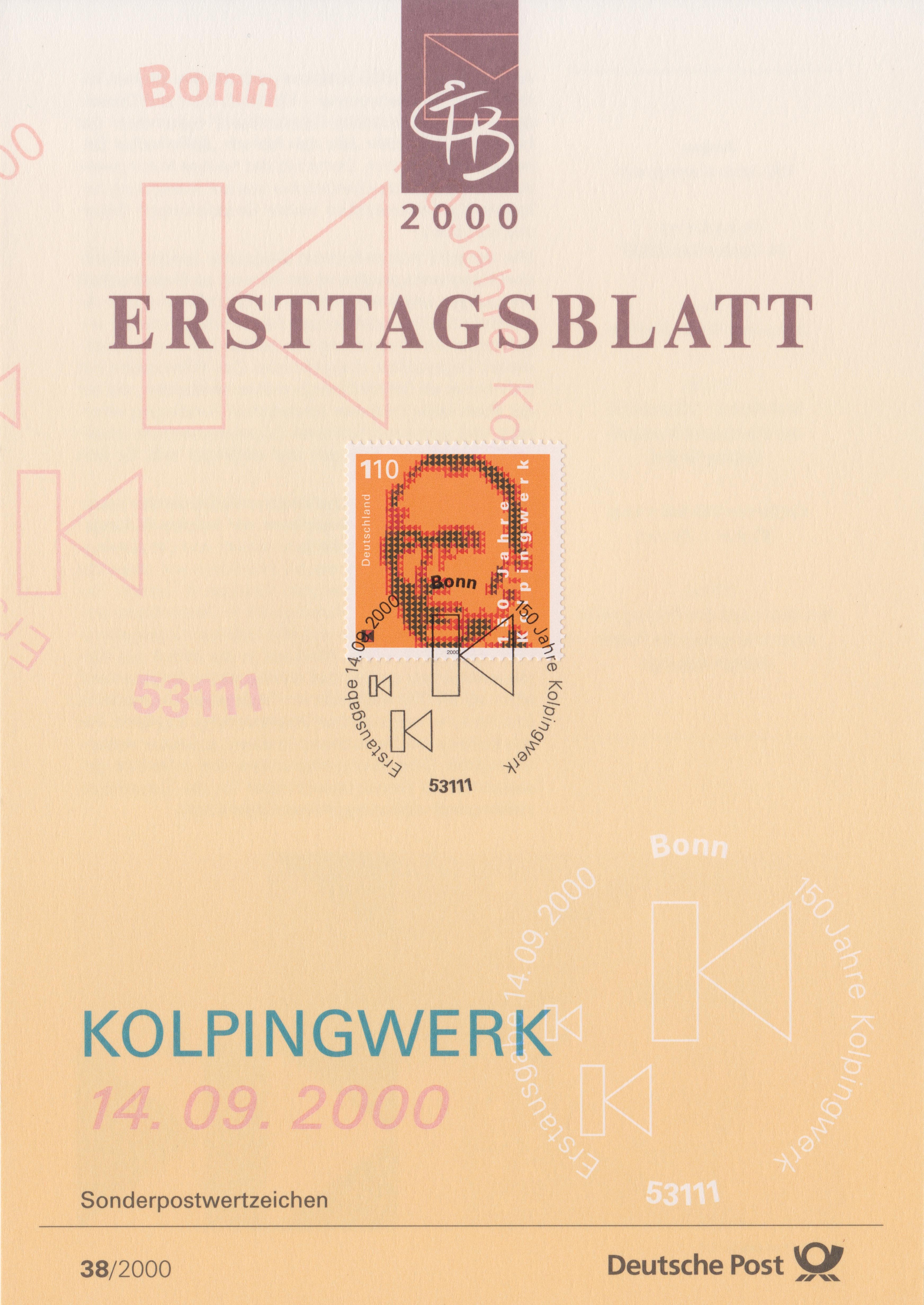 Am 14.09.2000 erschien aus Anlass des Jubiläums "100 Jahre Kolpingwert" das Postwertzeichen Bund MiNr. 2135, hier auf ETB 38/2000:
