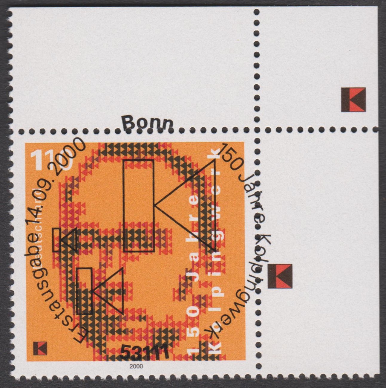 Dieses Postwertzeichen gibt es mit dem auf Feld 10 bei einer Teilauflage vorkommenden Plattenfehler "Spitze des obersten roten Dreiecks rechts des Scheitels verdickt", katalogisiert als MiNr. 2135 I, hier auf dem ETB 38/2000: