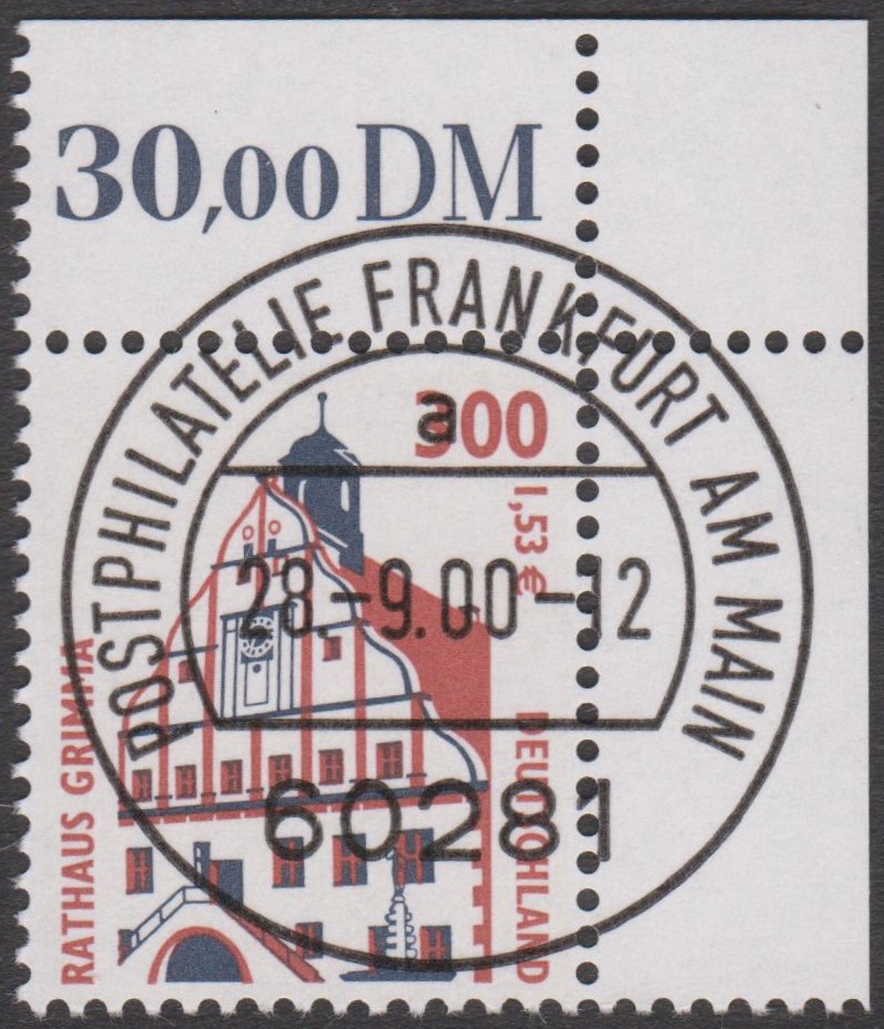 Bund MiNr. 2141, rechte obere Bogenecke des Zehnerbogens mit Reihenwertzahl "30,00 DM" im Oberrand und EST POSTPHILATELIE FRANKFURT AM MAIN:
