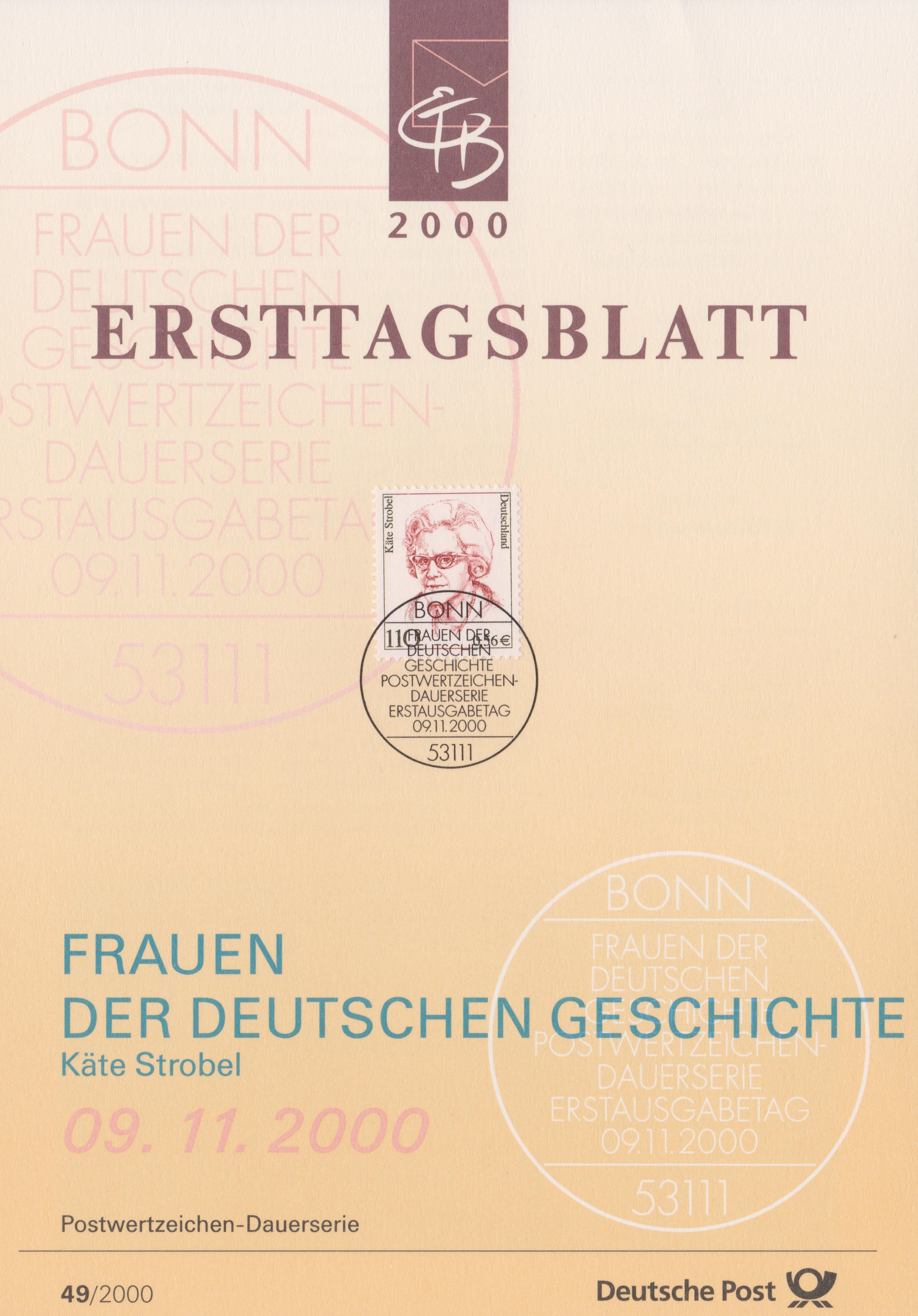 Das ERSTTAGSBLATT 49/2000 vom 09.11.2000 zeigt die Freimarke der Dauerserie "Frauen" in Doppelnominale mit dem Motiv "Käte Strobel":
