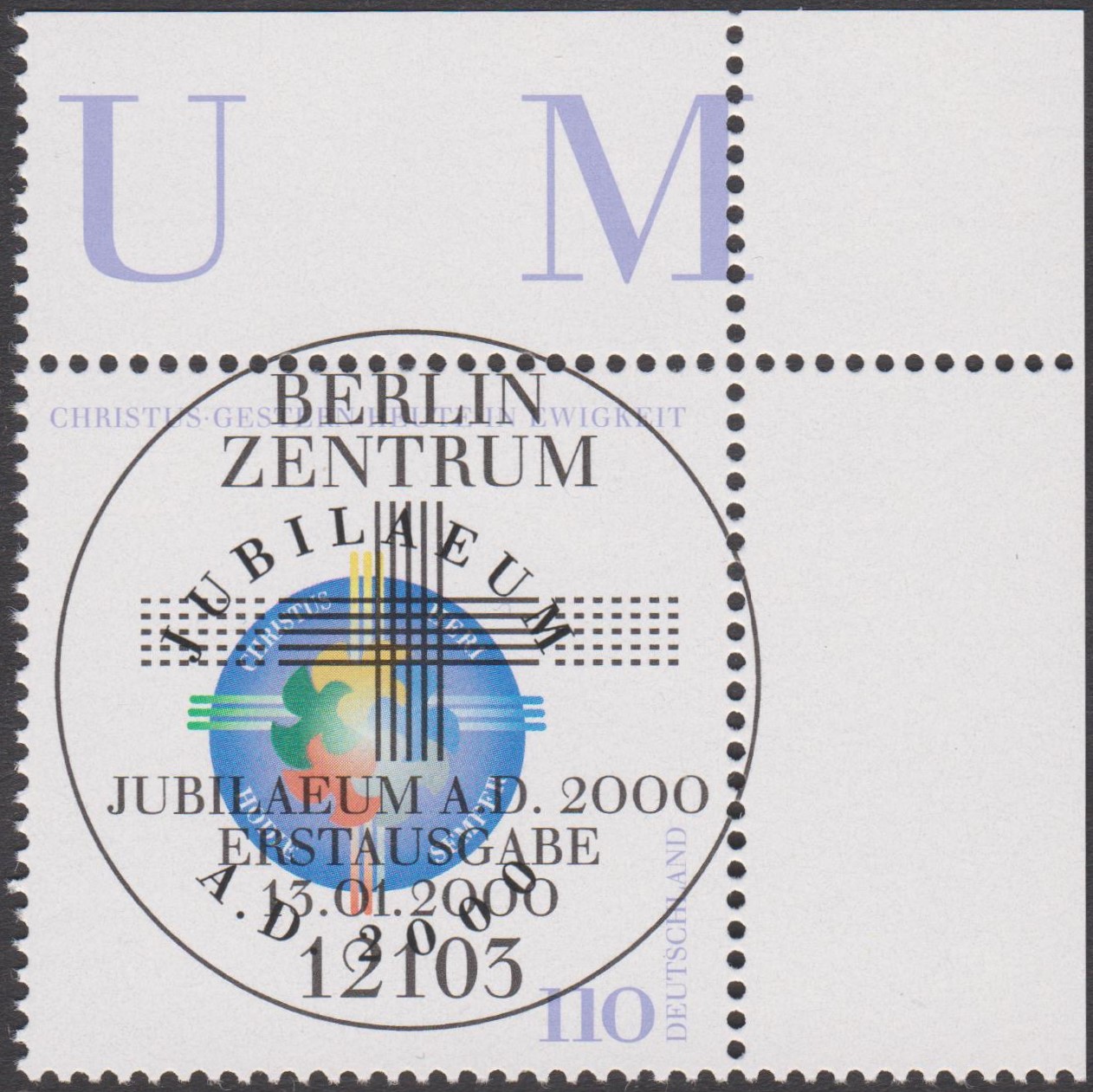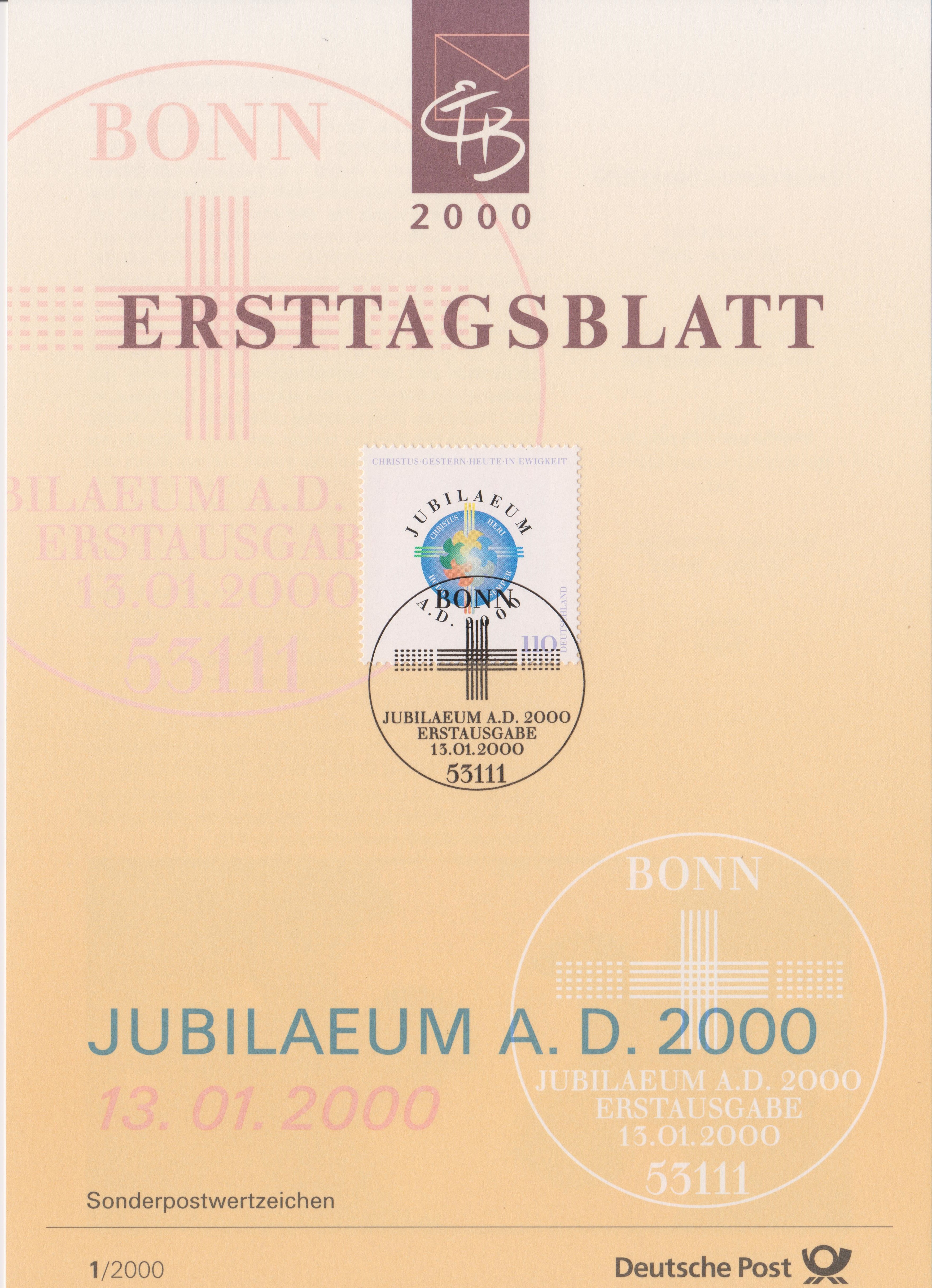 "JUBILAEUM A. D. 2000" lautet das Motto dieses Ersttagsblattes 1/2000 mit Bund MiNr. 2087: