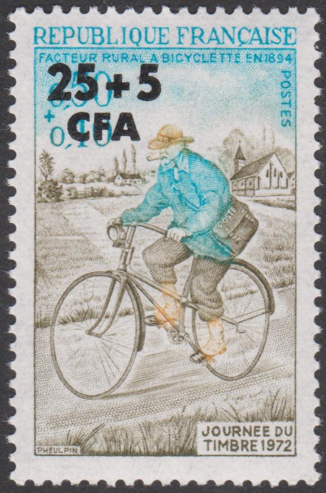 Frankreich MiNr. 1784 erschien am 18.03.1972 zum Tag der Briefmarke 1972 und zeigt einen Landbriefträger auf seinem Fahrrad, hier als Maximumkarte mit Ersttagsstempel PARIS:
