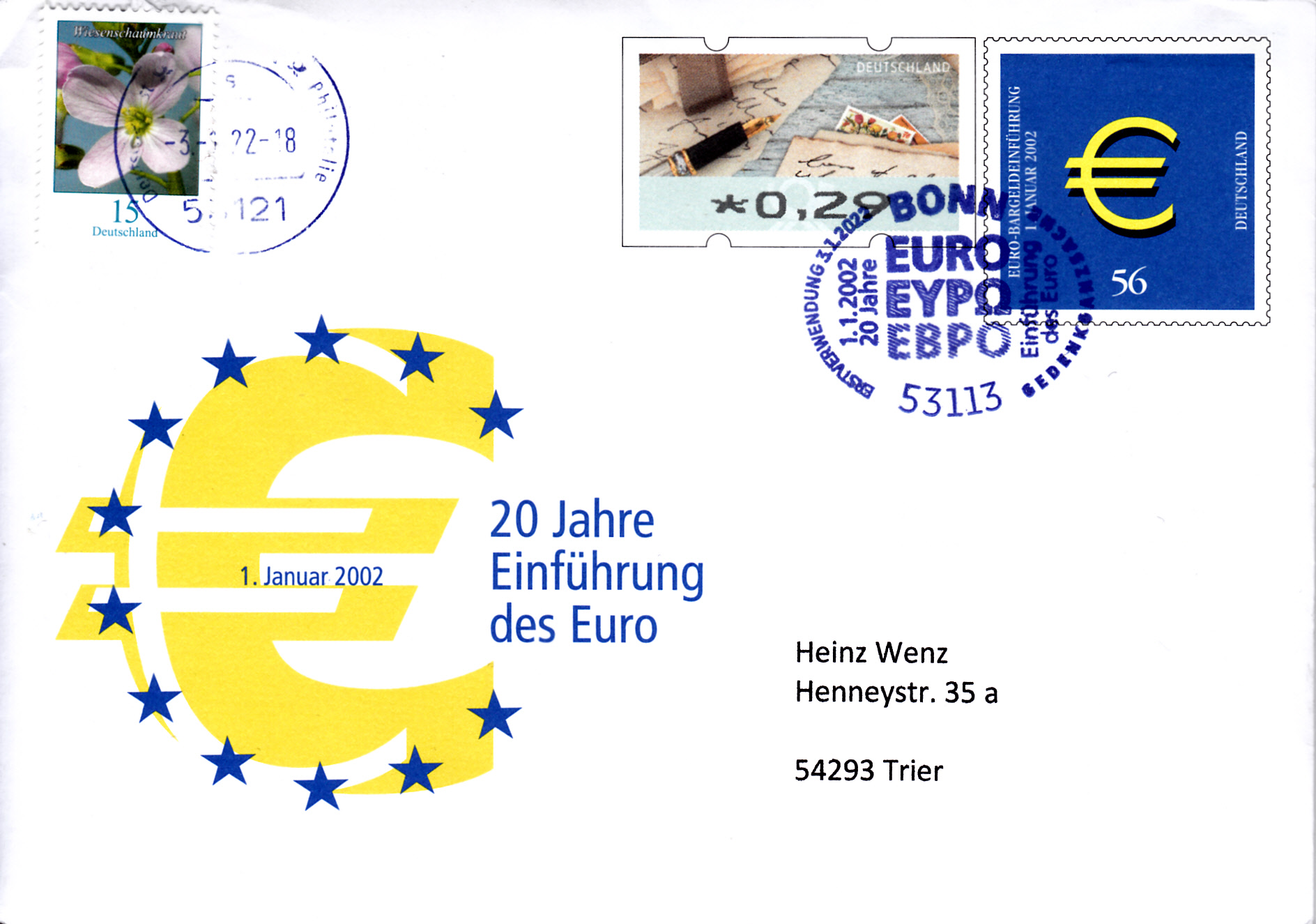 Aus Anlass "20 Jahre Einführung des Euro" wurde ein Ganzsachenumschlag mit dem Wertstempel zu 56 Cent mit dem Motiv "Einführung der Euro-Münzen und -Banknoten" und einem Wertstempel zu 0,29€ im Muster einer Automatenmarke herausgegeben.