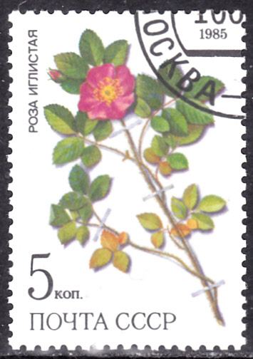 Auf einer Marke aus der Sowjetunion (MiNr 5530) wird ein Blütenstiel mit Blüte der Nadel-Rose (Rosa acicularis) gezeigt.
