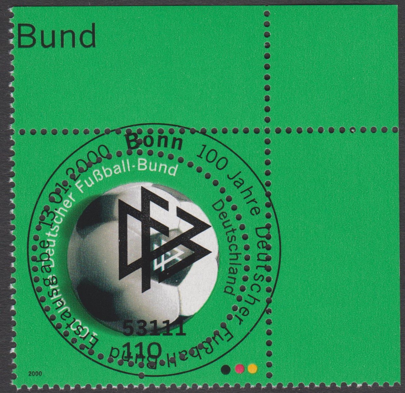Diese hier als Einzelfrankatur verwendete Briefmarke erschien am 13.01.2000 zum Anlass 100 Jahre Deutscher Fußball-Bund: