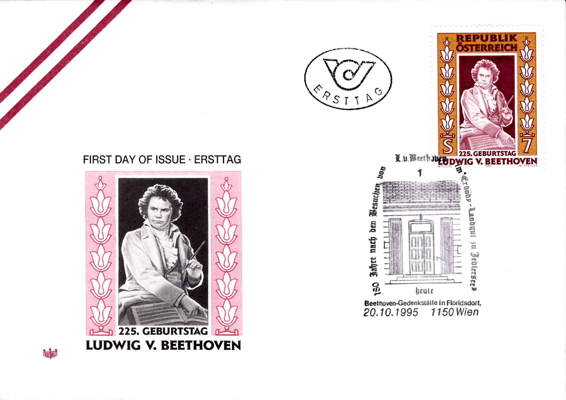 FDC mit der Marke aus Österreich zum 225. Geburtstag von Ludwig van Beethoven (MiNr 2175) und einem Sonderstempel mit der Kennziffer "1" aus Wien mit der Beethoven-Gedenkstätte in Florisdorf. Beethoven verweilte mehrfach zu Besuchen in diesem Haus.