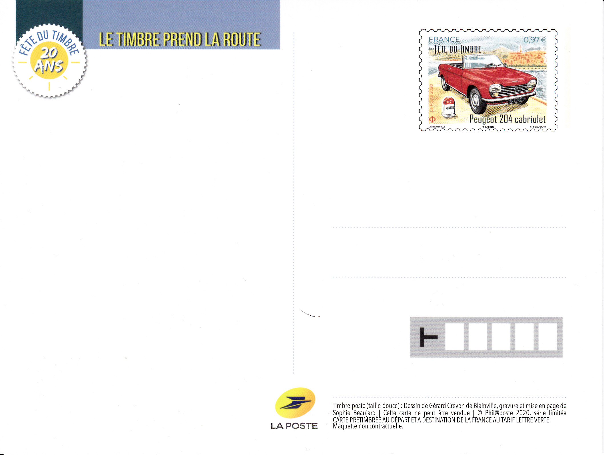 Zum Tag der Briefmarke 2020 (Fete du Timbre) erschien in Frankreich eine Ganzsache-Postkarte mit einem Wertstempel im Muster der Marke MiNr 3558 mit einem Peugeot 204 Cabriolet aus dem Jahre 1967.