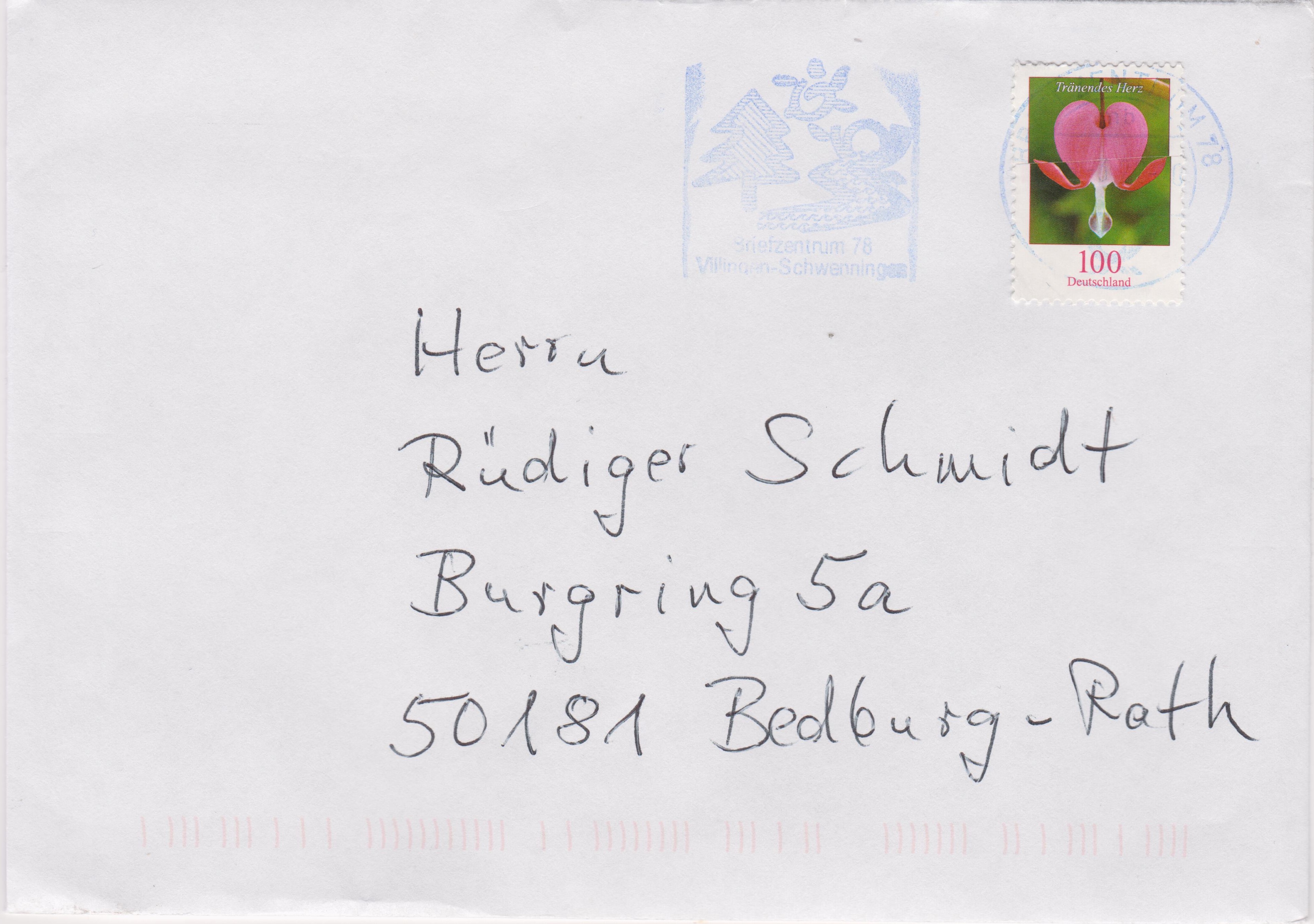 Für die selbstklebende Marke zu 37 Cent-Marke (MiNr 3662) gab es einen Erstverwendungsstempel mit dem Rotklee (Trifolium pratense) im Stempelbild. Die Blumenmarke auf dieser Karte ist mit dem Erstverwendungsstempel Bonn entwertet, die Zusatzfrankatur mit einem normalen Tagesstempel.