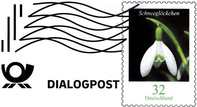 Faltbrief 210 mm x 102 mm mit Wertstempel der 32 Cent-Marke der Dauerserie "Blumen" (MiNr 3655) "Kleines Schneeglöckchen (Galanthus nivalis)" mit aufgedruckter Zähnung. Der Wertstempel ist mit einer Welle "Dialogpost" entwertet.