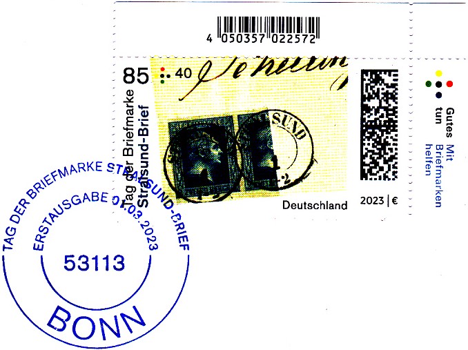 Die Marke zum Tag der Briefmarke 2023 wurde auch in einem Block (MiNr Block 91) gedruckt. Auf dem Blockrand wird ein weiterer Teil des Stralsund-Briefes gezeigt.