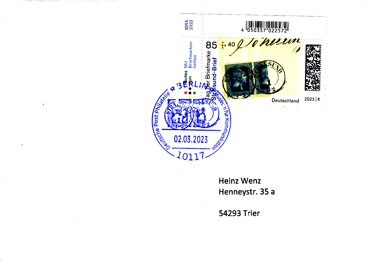 Dieser Brief mit der Marke zum TdB (MiNr 3752) wurde mit dem Sonderstempel zur Übergabe der Marke vom 2.3.2023 aus Berlin gestempelt.