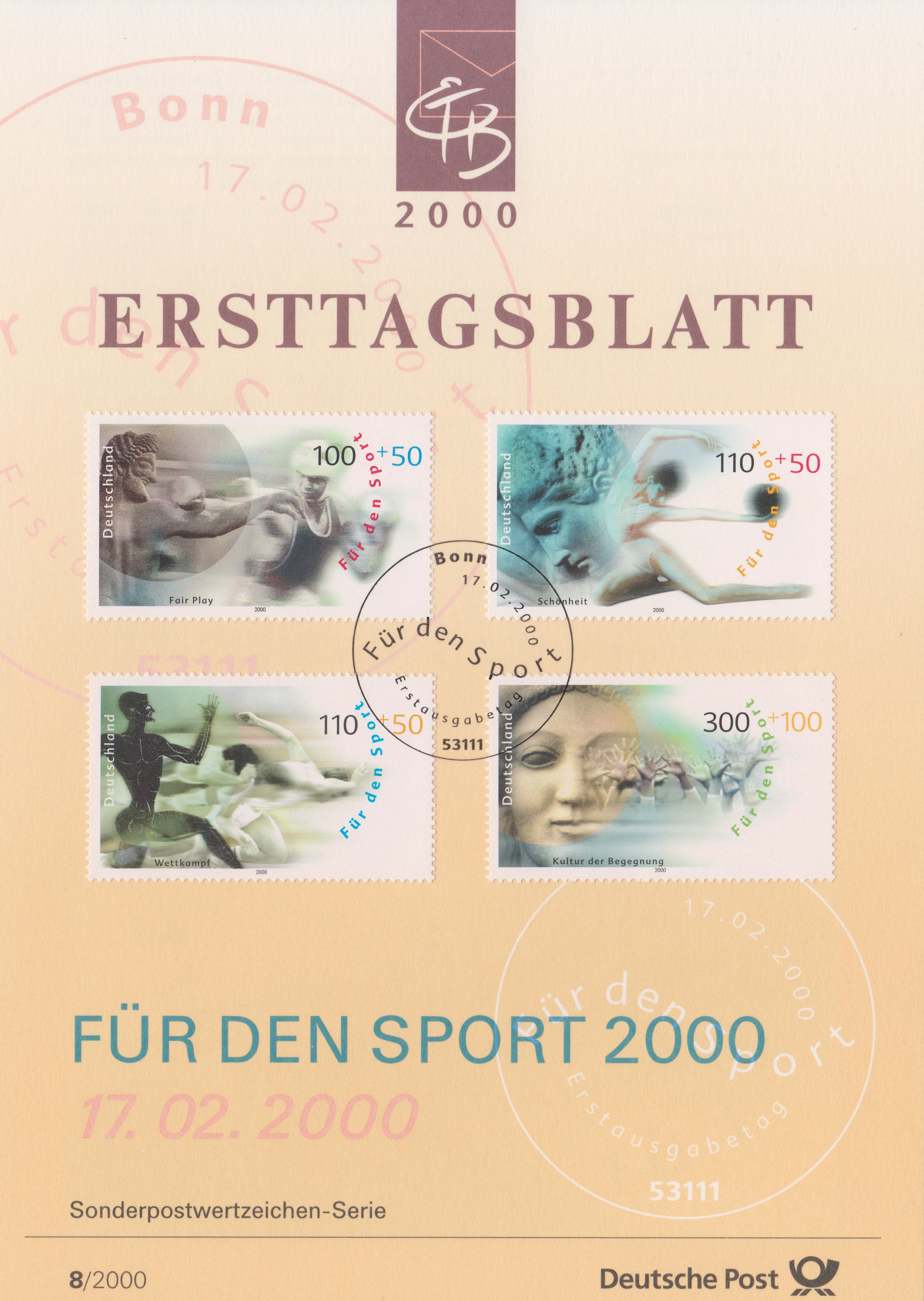 Das erste Postwertzeichen des vier Briefmarken umfassenden Satzes "FÜR DEN SPORT 2000" ist dem sportlichen Grundatz "Fair Play" gewidmet, hier auf ETB 6/2000: