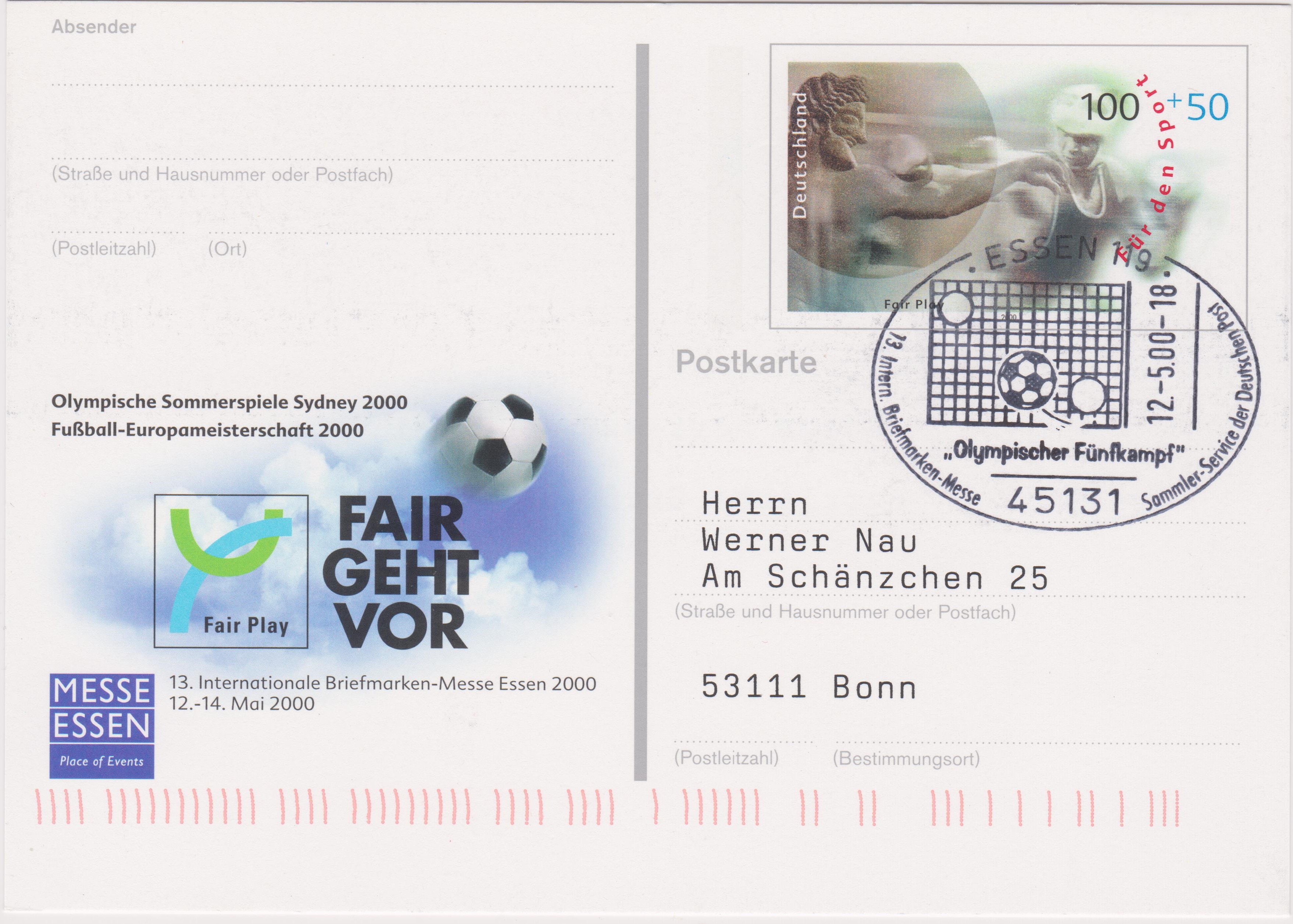 2000 erschien zur MESSE ESSEN eine Ganzsache mit dem Motto "FAIR GEHT VOR" und eingedruckter Bund MiNr. 2094, PSo 68, hier am 16.08.2000 aufgegeben in WEINGARTEN als "Grußflugpost zu den olympischen Sommerspielen 2000":