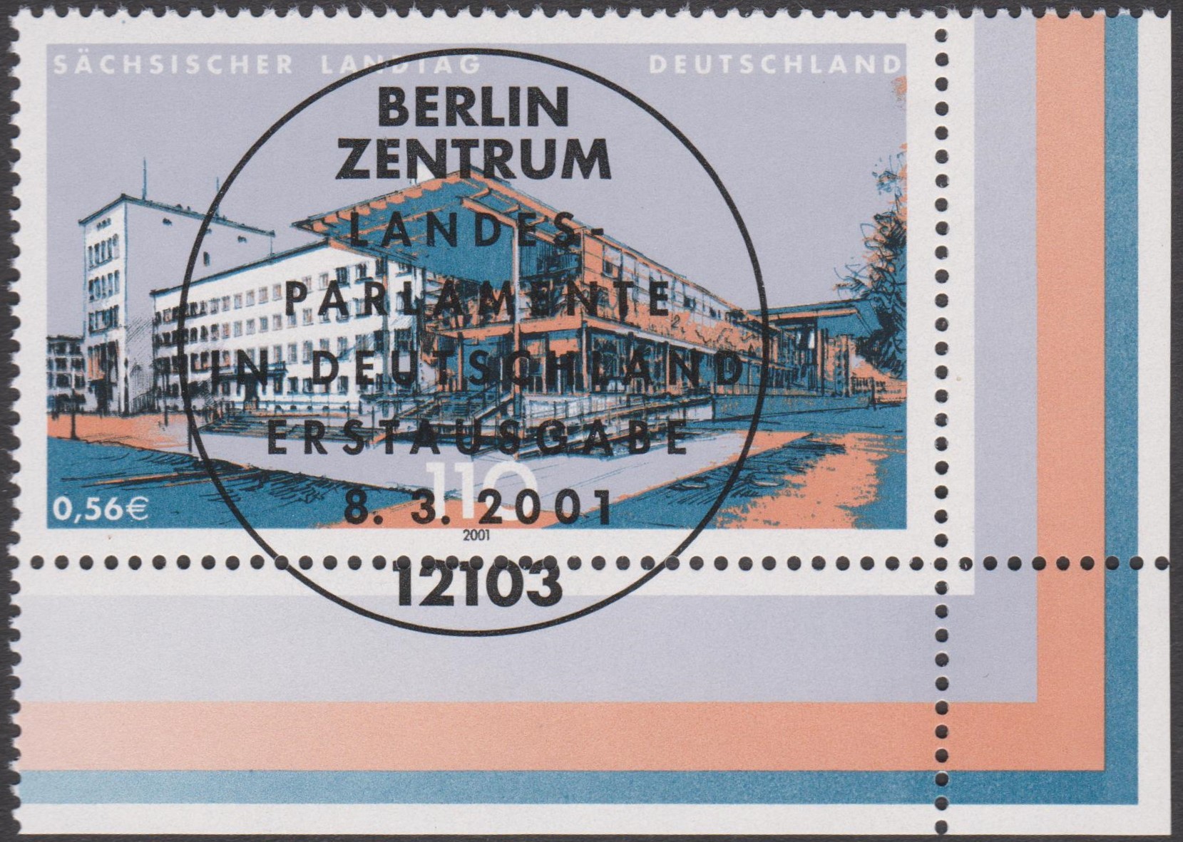 Motiv "Sächsischer Landtag in Dresden", Bund MiNr. 2172, als rechte obere Ecke (= Feld 2) sowie rechte untere Ecke des Zehnerbogens (= Feld 10) mit ESST BERLIN: